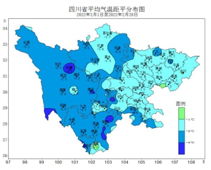 2月全省平均气温5.6℃,较常年同期偏低1.9℃,位列历史同期第11低位。壤塘、新龙、炉霍、泸定、得荣、乡城、攀枝花共7站平均气温列本站历史同期前3低位。