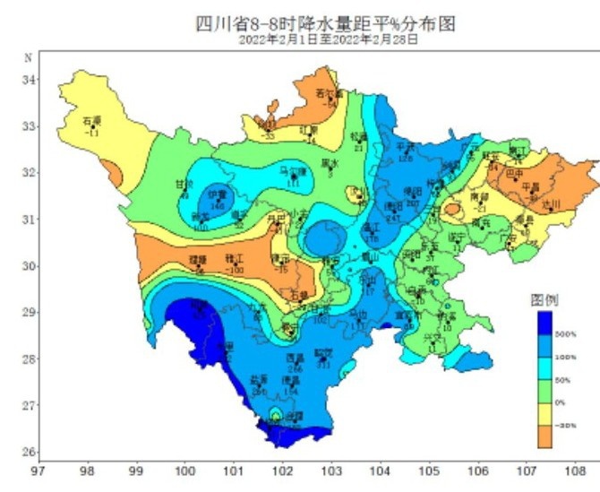 2月全省平均降水量21.4毫米,较常年同期显著偏多60%,位列历史同期第4多位。沐川、昭觉、布拖、北川、仁和、屏山共6站降水量为本站历史同期最多。