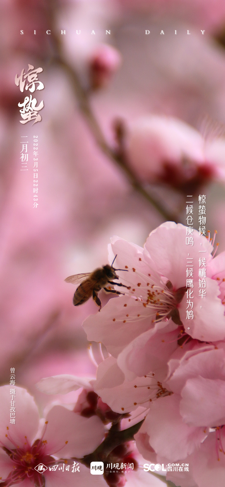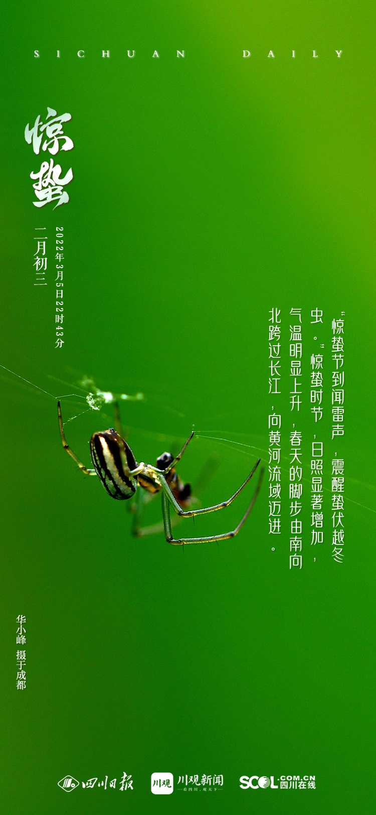 古代称惊蛰为“二月节”,即二月的节气,它标志着二月仲春的开始。惊蛰一般在3月5-6日,今年惊蛰是在3月5日22时43分34秒,这一时刻,太阳正好运行到黄经345°。
