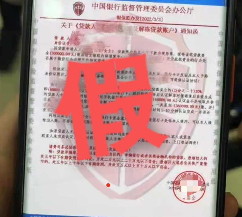 王先生讲述,自己在APP上面申请了30万元额度的贷款,但APP“客服”告知他,因“借款人账户信息不符”,贷下来的款被“银保监会”冻结了,需要提供银行卡卡号进行解冻。王先生输入卡号后,“客服”又以输入卡号错误为由要求他通过农行手机银行向“银保监会”指定账户进行转账支付6万元。犹豫再三后,王先生并未转账。当银行工作人员询问转账用途以及是否认识收款人时,王先生回答是网上贷款解冻的费用。