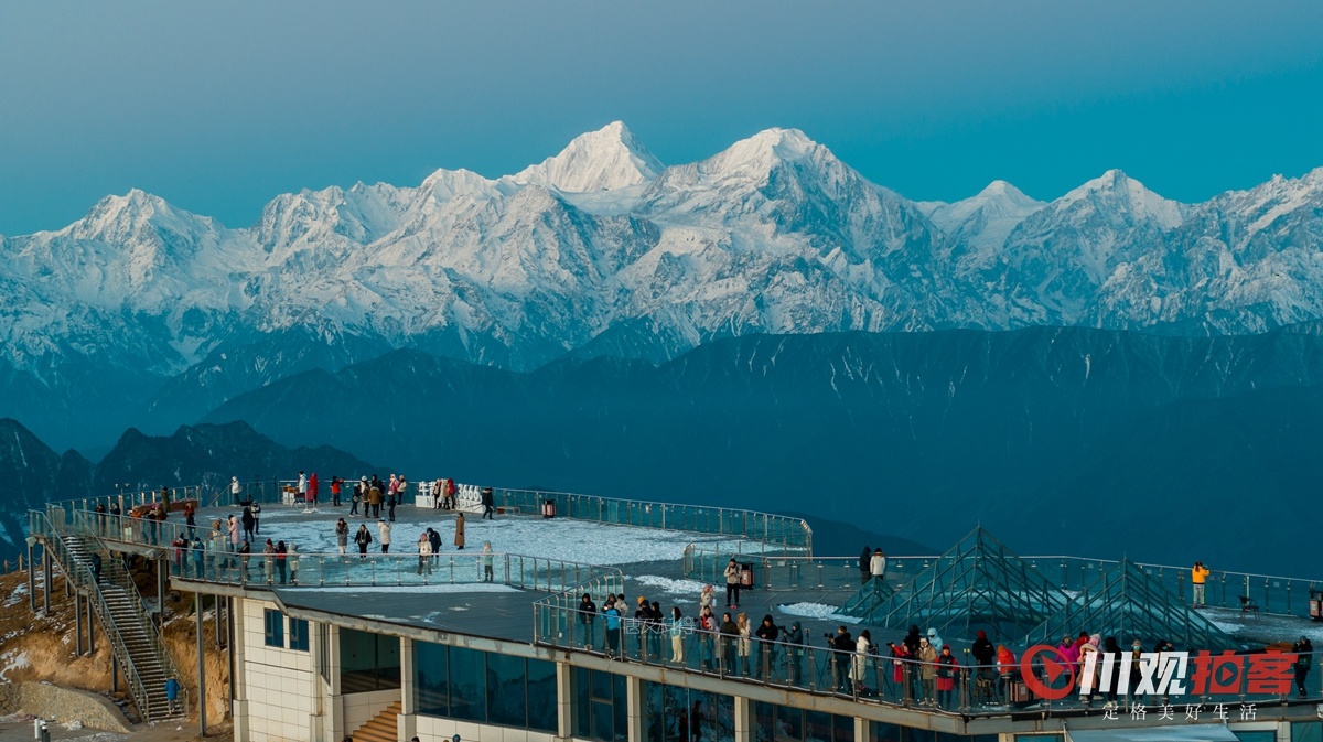 从成都出发,自驾大约3.5小时就能抵达半山腰的长海子停车场。如果天气好,在停车场就能拍到雄伟的贡嘎山。“唐及科得”一行人在5点前检票乘坐大巴车上山,路上能看见雾凇,还会“穿越”云海。
