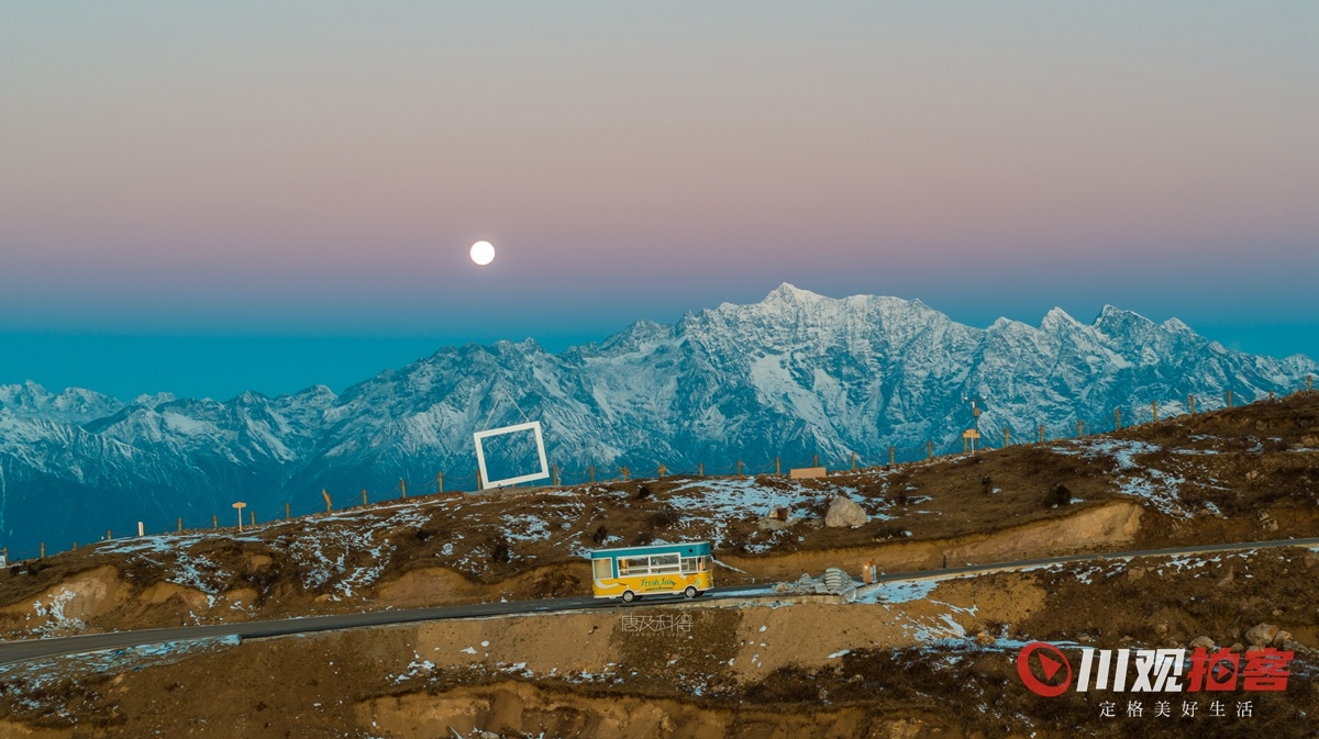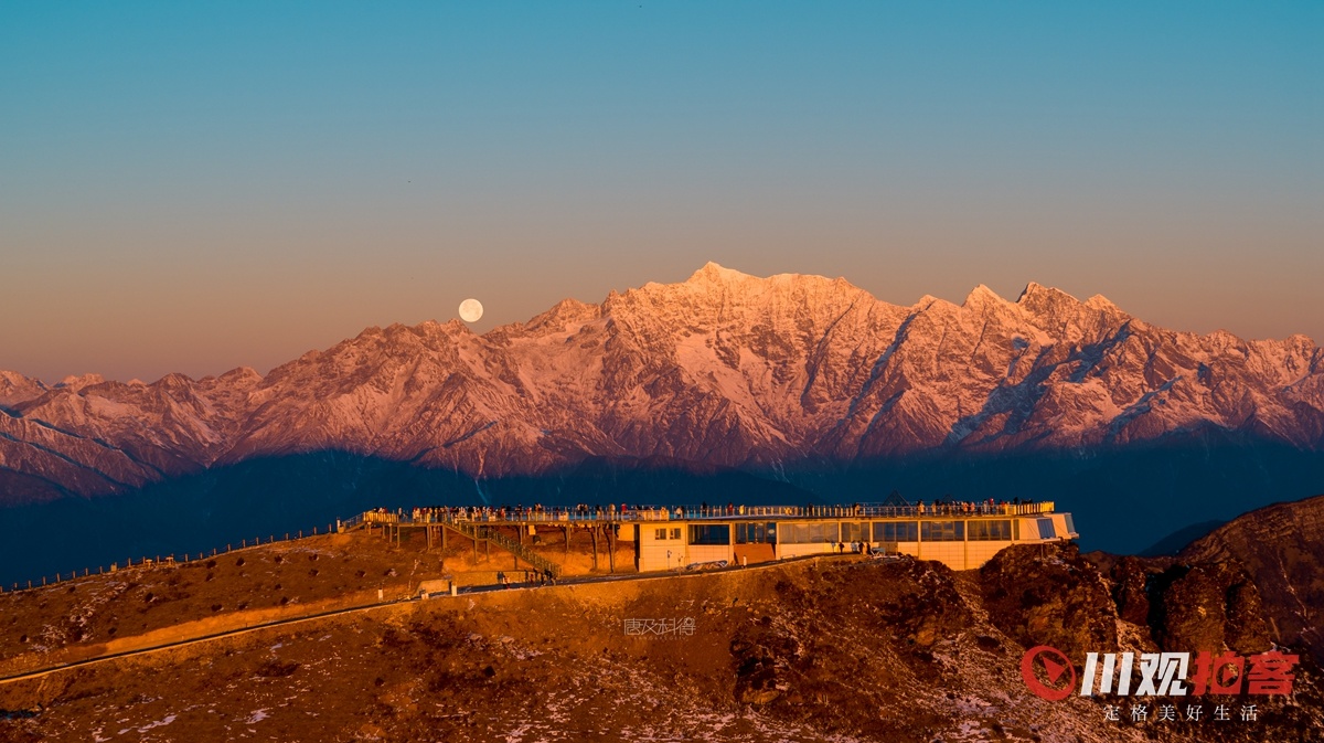 日出时眺望贡嘎雪山,还没来得及落下的月亮也惊艳入镜。