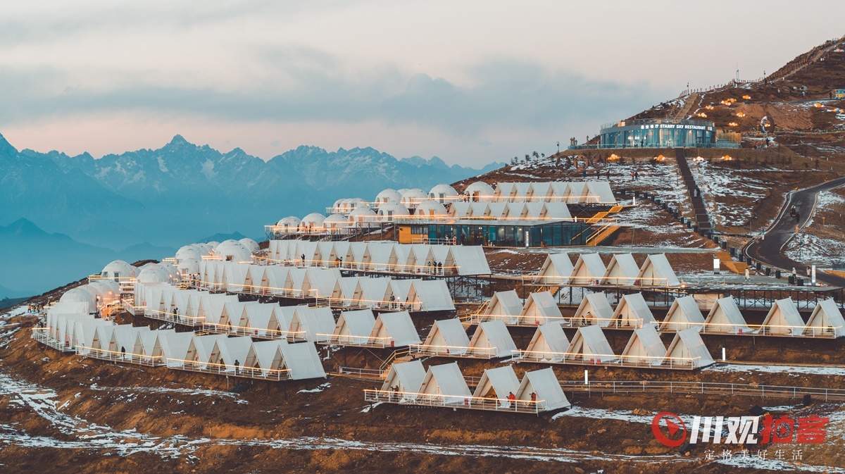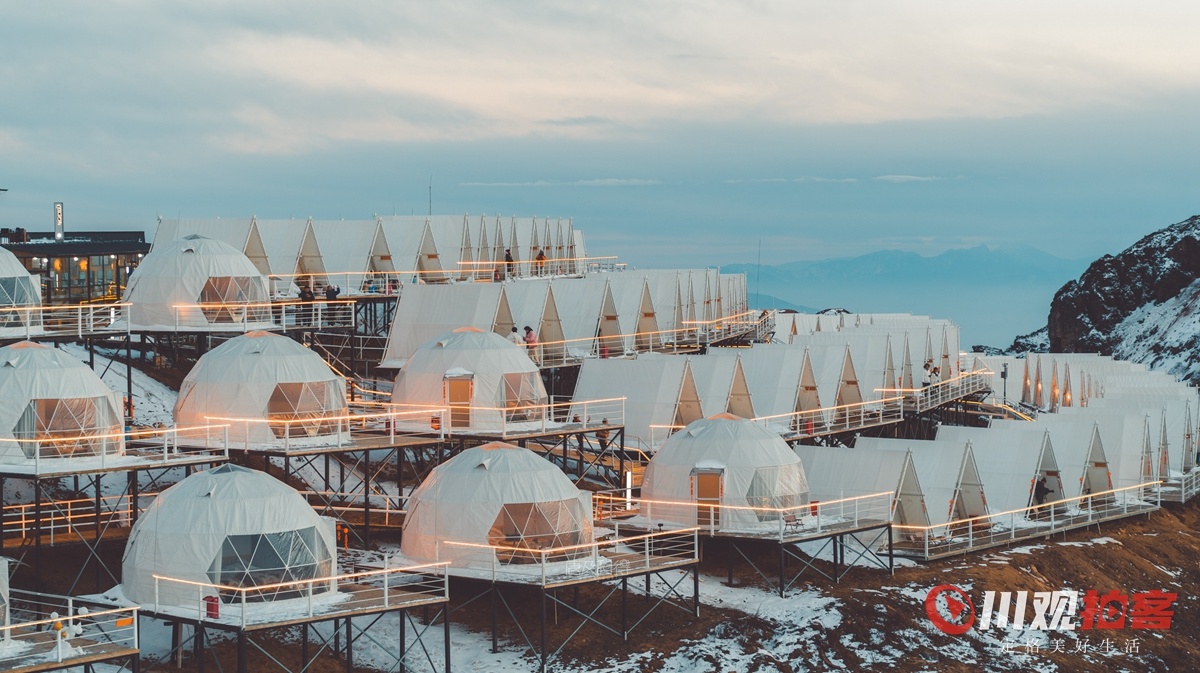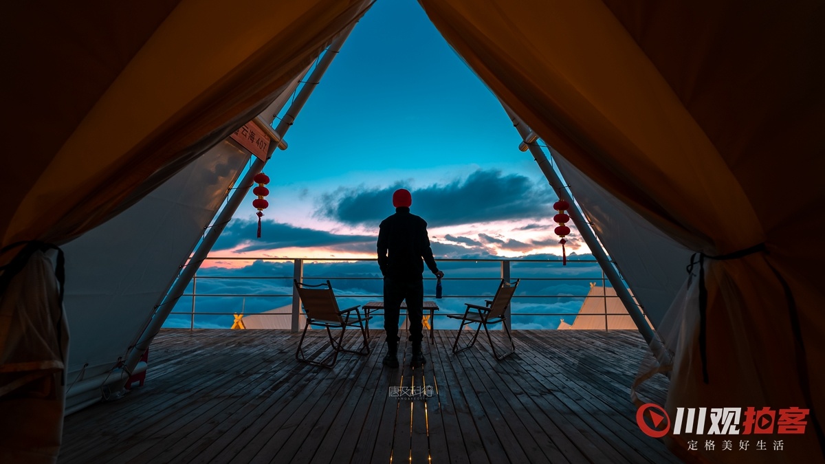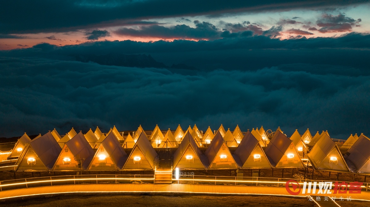日落时分,住宿区帐篷外可以看到云海翻涌,当灯光亮起后进行拍摄效果极佳。低温天气下,日落后还可能突然降温下雪,也算是另外一种惊喜吧。