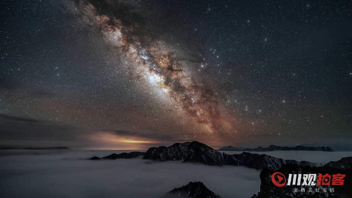 半夜如果云层散开,你会看到西面星空下的贡嘎雪山群,还有东面云海上缓缓升起的银河,画面美如童话。