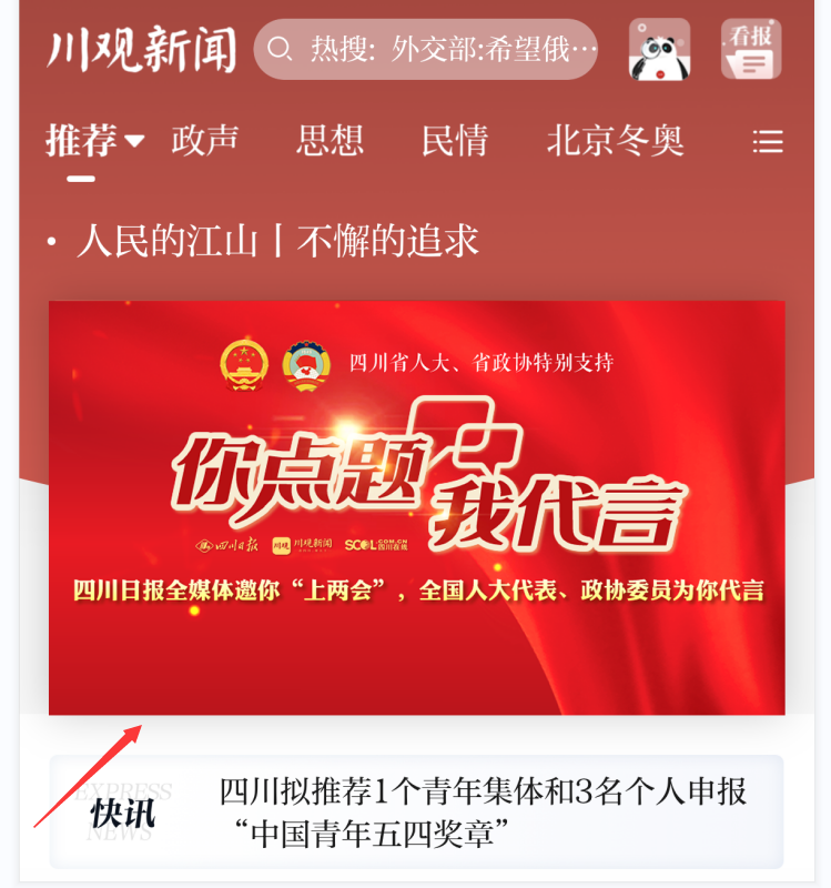 方法二:打开川观新闻客户端,在首页幻灯区点击活动页面进入,点击“点题”按钮可进行留言。