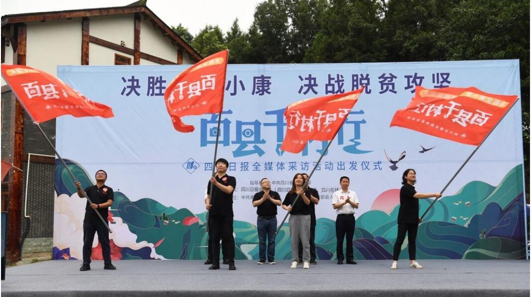 7月23日,在南充市南部县八尔湖镇纯阳山村,四川日报全媒体“决胜全面小康 决战脱贫攻坚”大型报道之“百县千村行”采访活动正式出发。脱贫户姚素琼成为授旗者,在平板电脑上按下启动键,将采访队旗从“云端”授给在全省各地整装待发的记者。