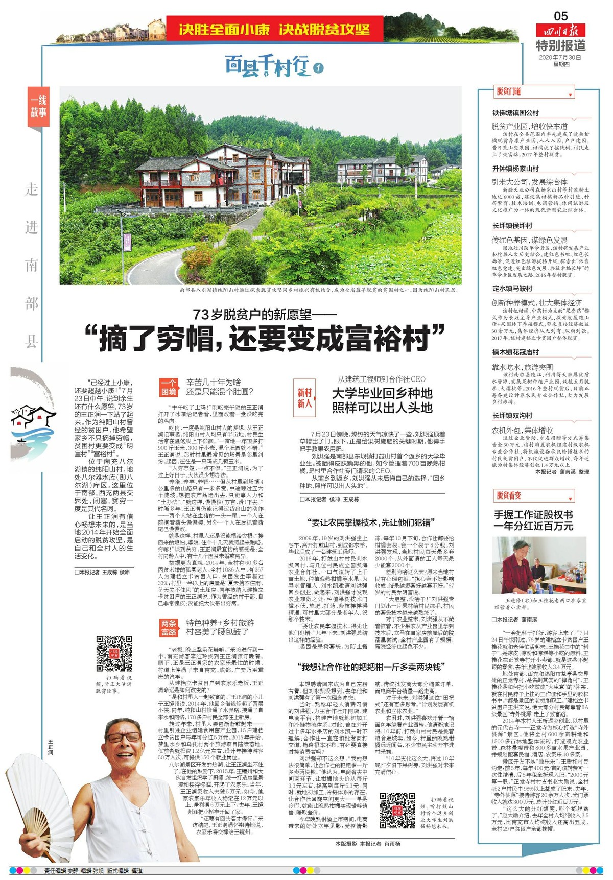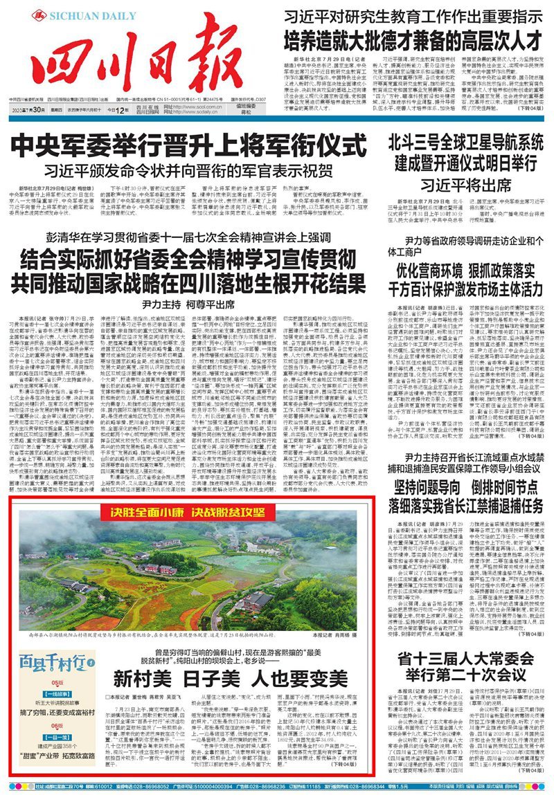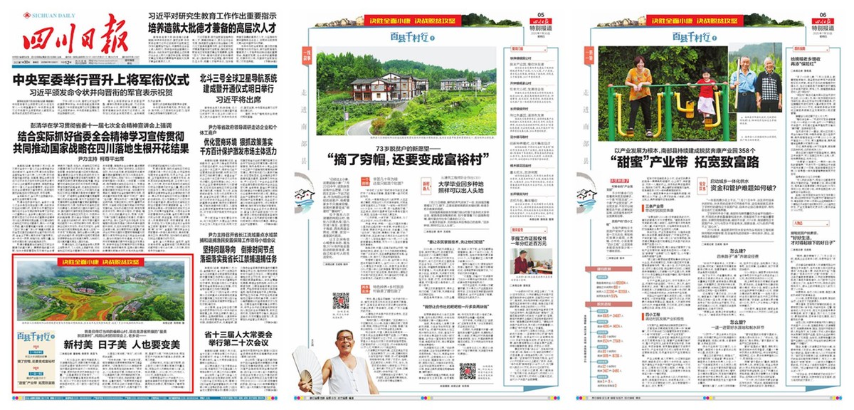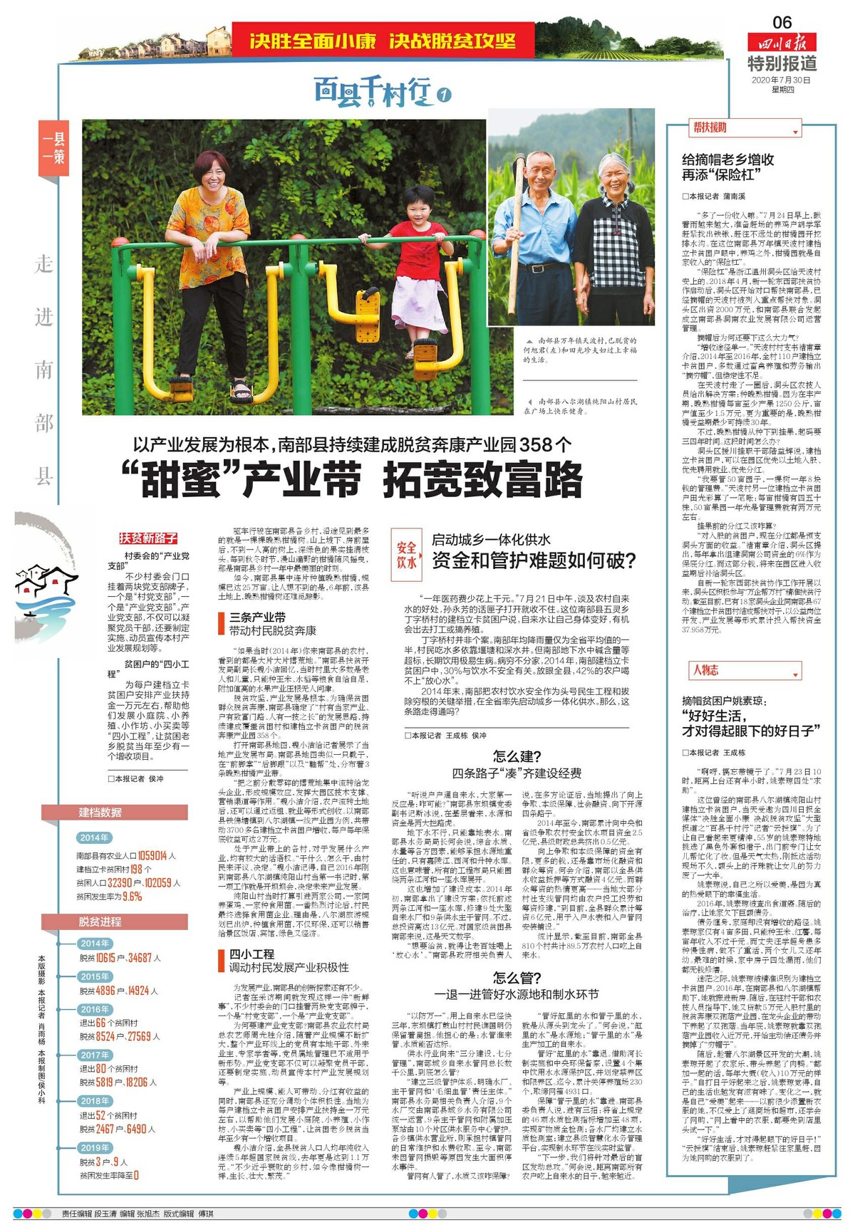 一周后,7月30日,四川日报在第一版推出通讯,及两个整版的特别报道,聚焦南部县的脱贫攻坚奋斗路,有现场,有故事,有人物,有产业,从多个侧面生动而理性地介绍了南部县的山乡巨变和成功经验。
