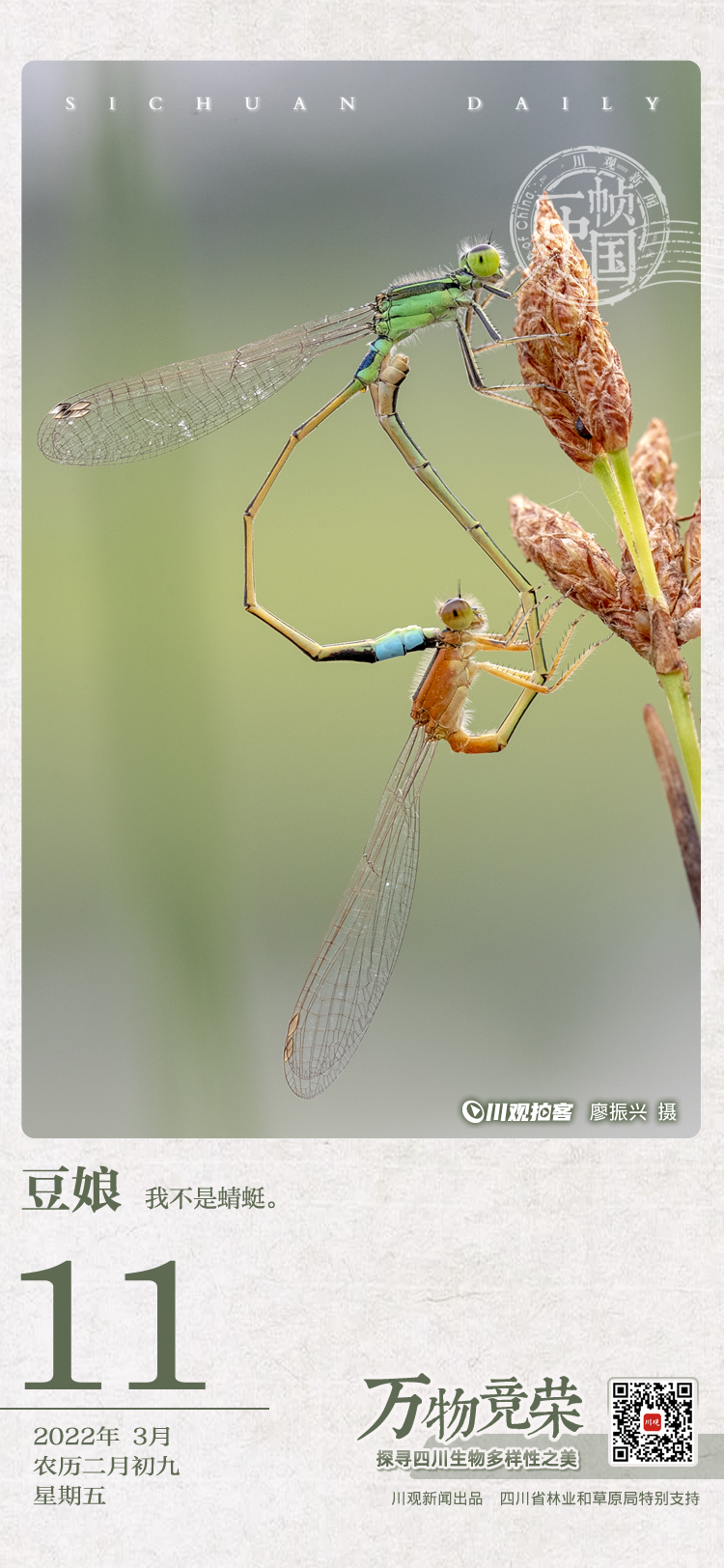 圆鼓鼓的大眼睛,机翼造型的翅膀,纤细的身体——这些蜻蜓有的外形特征它都有,但它不是蜻蜓,它叫豆娘。