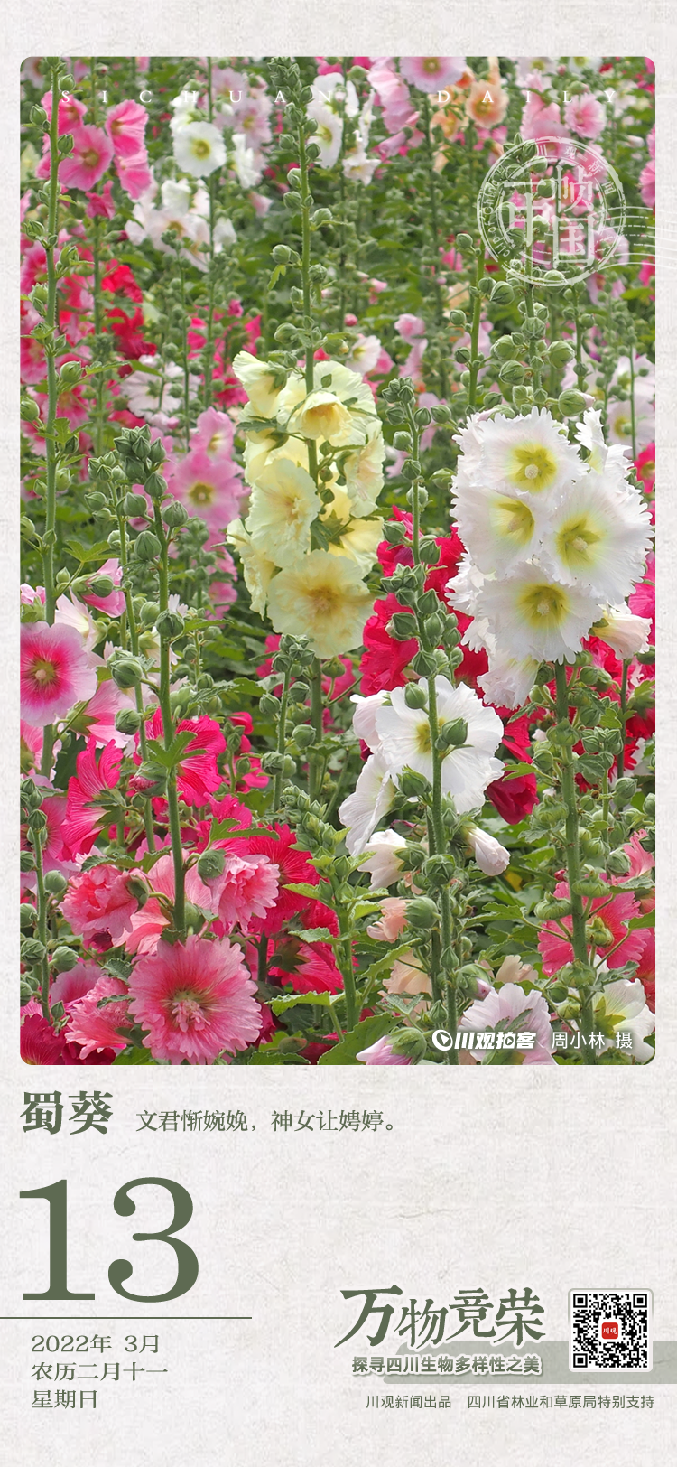 “剑门南面树,移向会仙亭。锦水饶花艳,岷山带叶青。文君惭婉娩,神女让娉婷。烂熳红兼紫,飘香入绣扃。”唐朝诗人徐寅,在诗词《蜀葵》中这样描写蜀葵。