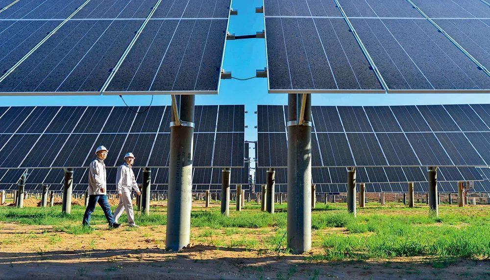 ▲ 2021年7月8日,工作人员在内蒙古伊金霍洛旗天骄绿能50万千瓦采煤沉陷区生态治理光伏发电示范项目区里巡查 王正摄
