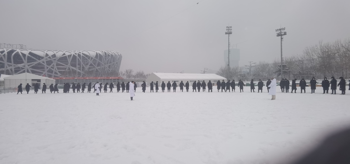 张雪记得,2月13日,北京下起了很大的雪,为保护鸟巢的地屏,只能用防潮布将其盖住,演员们没法入场排练。导演组就和演员们在鸟巢旁边的副场空地里,顶着鹅毛大雪,一遍遍练习举旗、放下,变化队形。“好在,公安大学的学生们平日里习惯了听口令执行命令,反而对音乐变化没有过于敏感,最后就是靠导演通过FM发指令,引导他们完美完成了表演。”