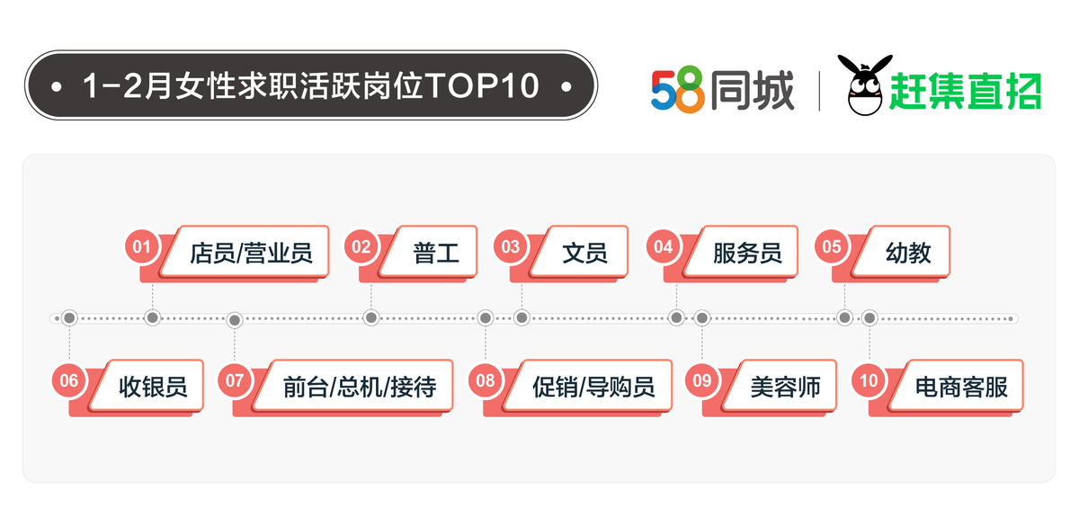 从女性求职者关注的具体职位来看,营业员、文员、服务员、幼教、收银员、前台、促销、美容师、电商客服为女性求职热门职位TOP10。这些职业要求从业人员具备善于沟通、亲和力强等素质,体能消耗相对较少,受到女性求职者的青睐。