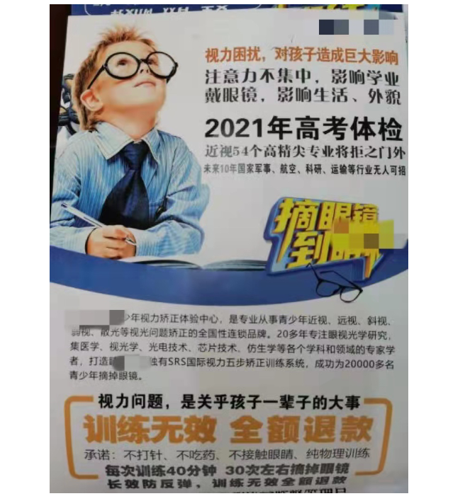 广告利用“王某某”等人名义及形象进行诊疗前后效果对比,利用所谓的“SRS国际视力五步矫正训练系统”“成功为20000多名青少年摘掉眼镜”等误导性表述,对儿童青少年近视防控产品进行营销,违反《中华人民共和国广告法》的多个条款。“这正是市场监管部门的重点打击对象。”执法人员说。