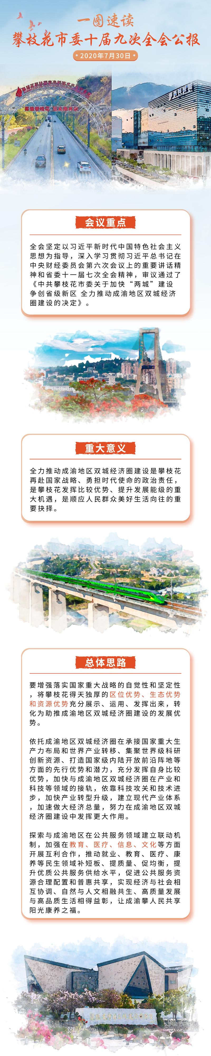 全会坚定以习近平新时代中国特色社会主义思想为指导,深入学习贯彻习近平总书记在中央财经委员会第六次会议上的重要讲话精神和省委十一届七次全会精神,审议通过了《中共攀枝花市委关于加快“两城”建设 争创省级新区 全力推动成渝地区双城经济圈建设的决定》。