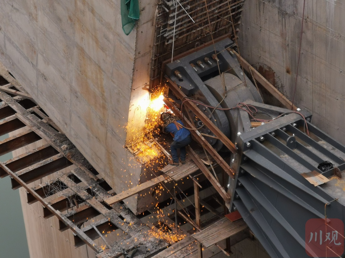 3月3日,位于巴中市恩阳区恩阳河上的黄石盘水库大坝施工现场,焊花四溅,几十名工人分成不同班组,同步在大坝上开展设备安装、机房搭建和路面平整等作业。