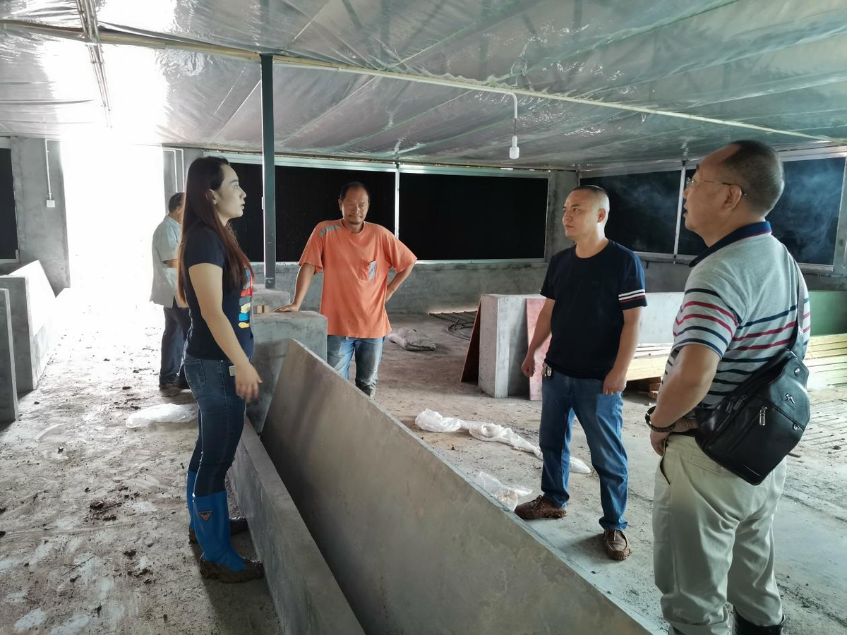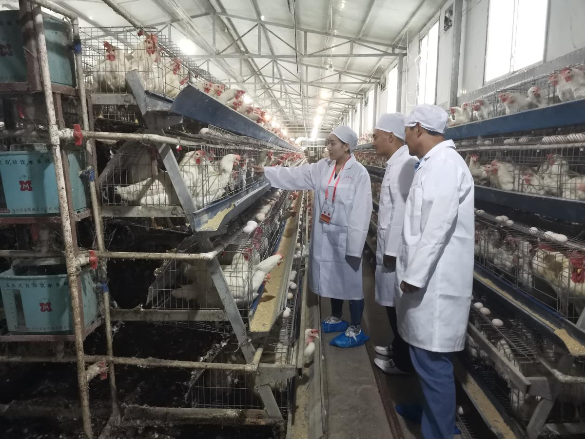 康润敏(左一)与家禽养殖企业交流养殖技术。