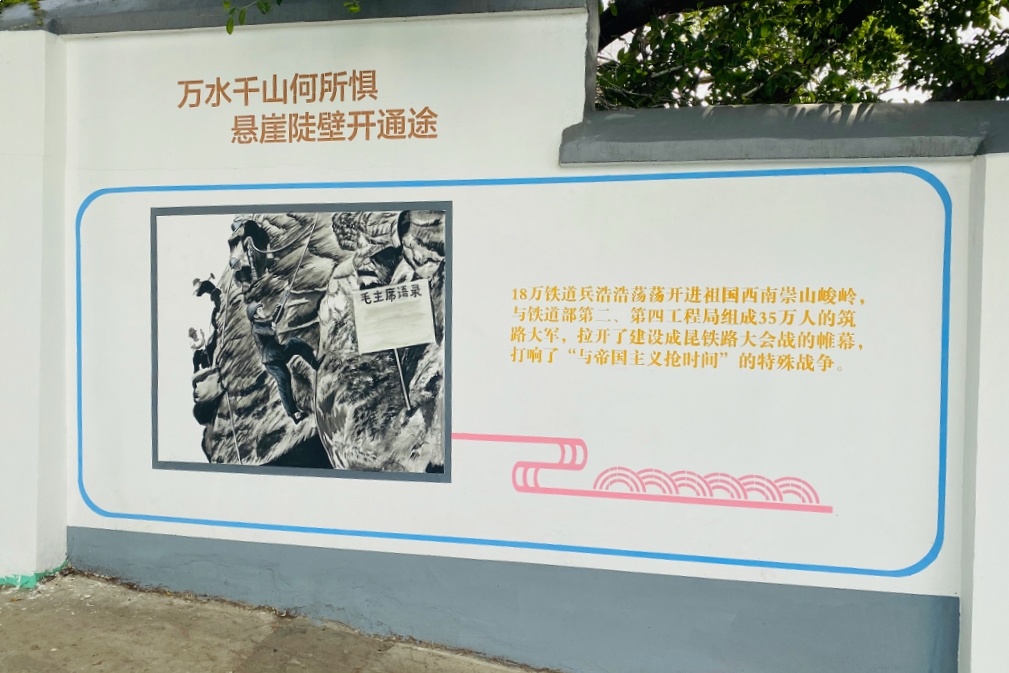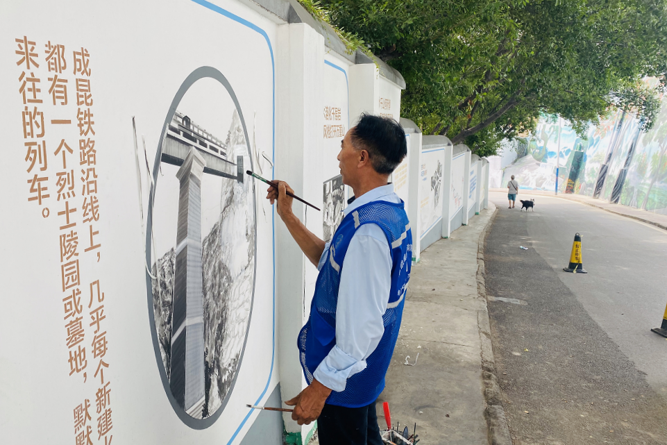 一幅幅生动的成昆铁路建设墙绘图,浓缩了成昆铁路的建筑史。“这么多年过去了,看到墙上这些场景,就想到那些不畏艰辛、不怕牺牲的建设者,很感动。”82岁的社区居民潘昭琼触景生情,作为成昆铁路建设者的亲属,见证了成昆铁路的发展变化。