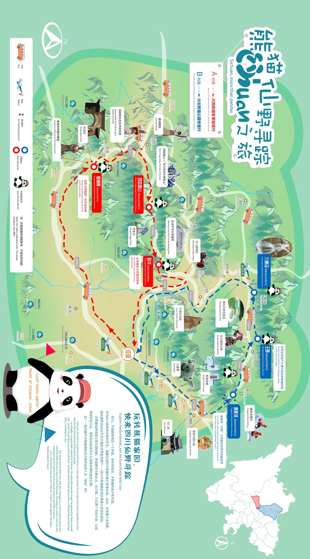 新形式、新角度,全新体验包罗万象的四川文旅。从“熊猫老家”宝兴县到“熊猫幼儿园”卧龙,从“东方阿尔卑斯”四姑娘山到“藏羌风韵”阿坝州,从“天然基因库”唐家河到“人间仙境”九寨沟,川西熊猫老家秘境行和川北熊猫公园世遗行跟随野生大熊猫足迹,勾勒出大美四川旅游线。
