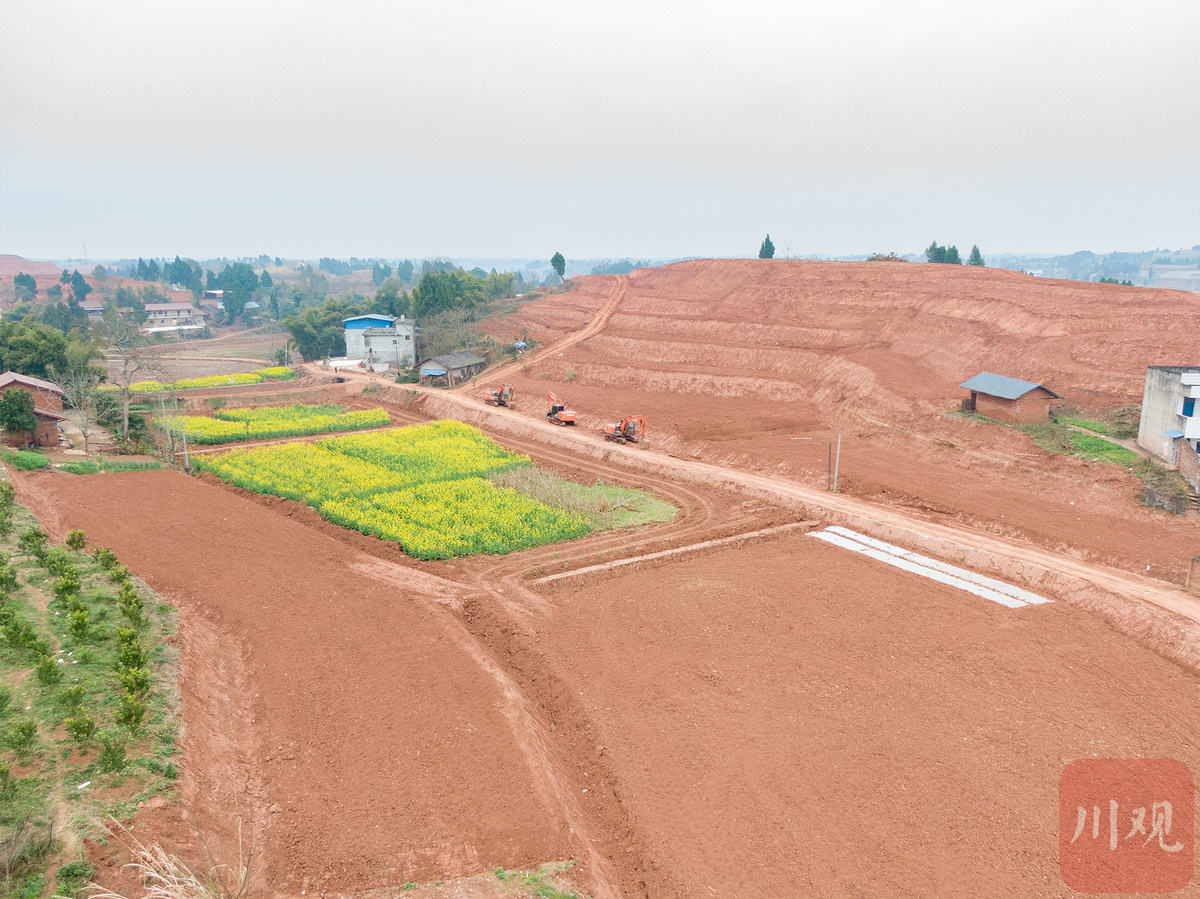 3月8日上午,在内江市资中县龙江镇百乐村“五良”融合宜机化改造现场,10多台挖掘机在临近的山坡上来回翻土。站在高处看,映入眼帘的是一块块平整的土地。