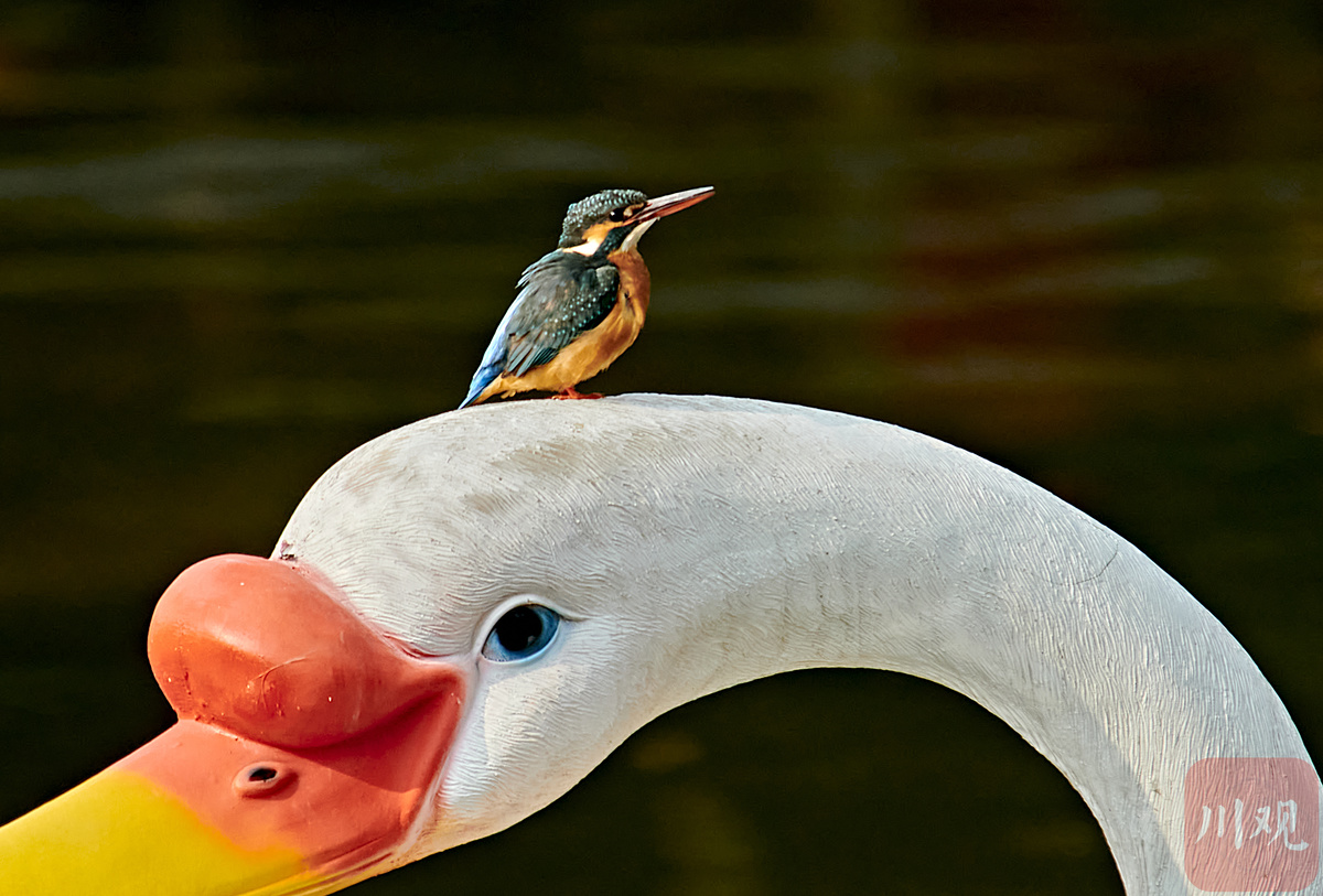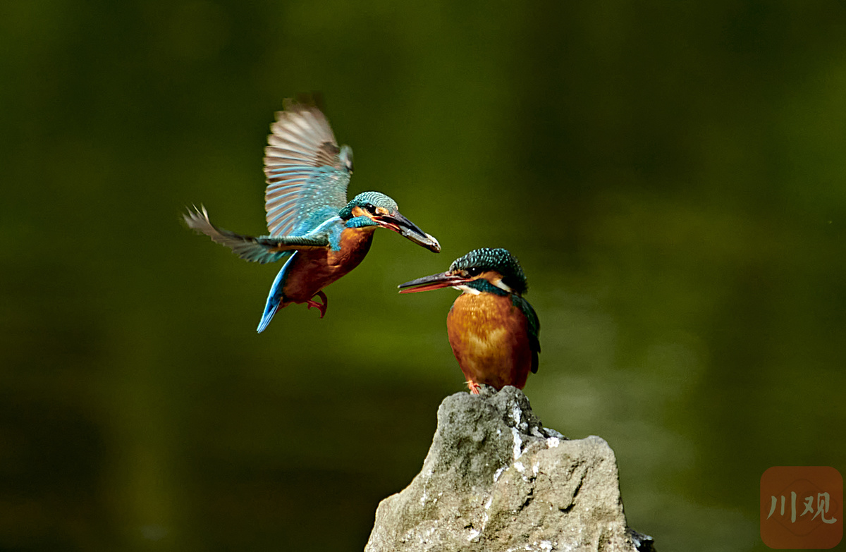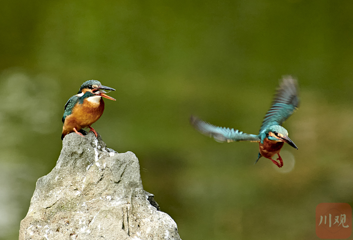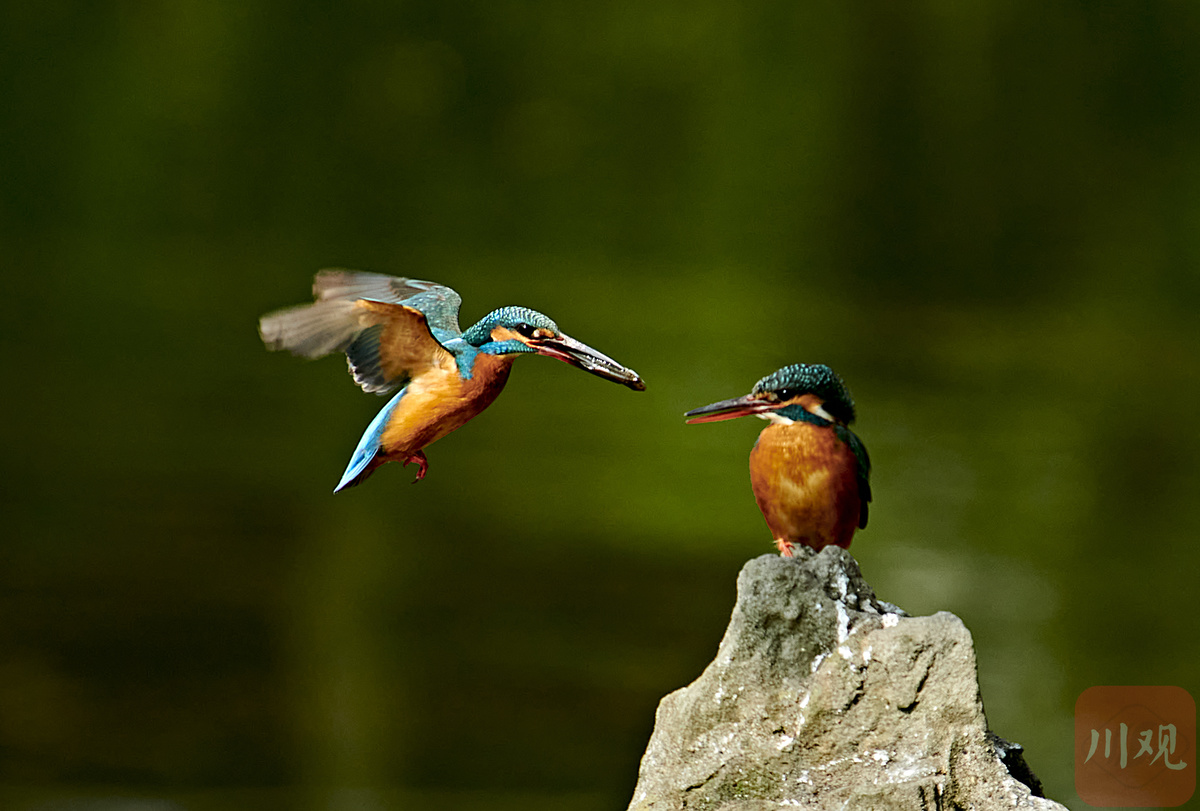 当天,川观拍客在到达文化公园10分钟后,伴随着一阵欢快的鸣叫声,一对翠鸟从远处紧贴水面飞行,停落在池塘中的假山上。从翠鸟现身的那一刻起,池边的嘈杂声戛然而止,取而代之的是相机快门的“咔咔”声。