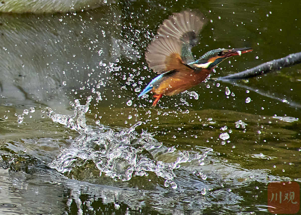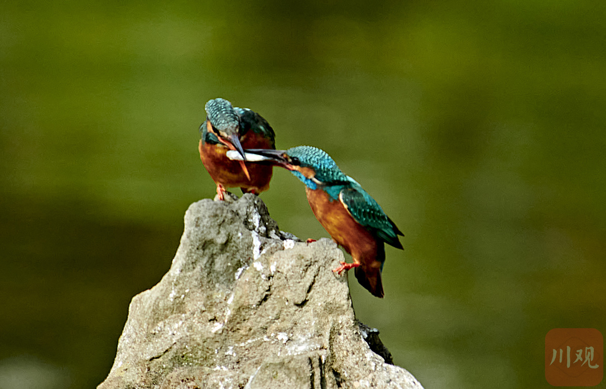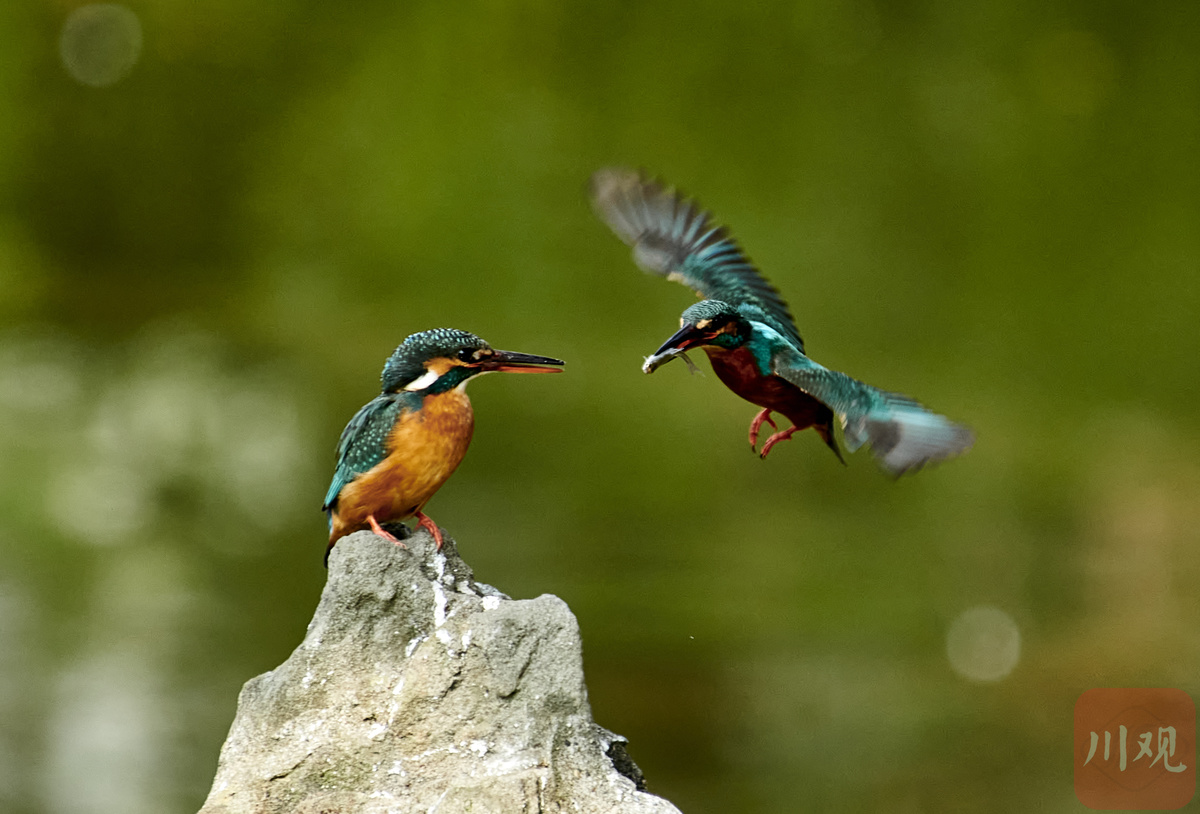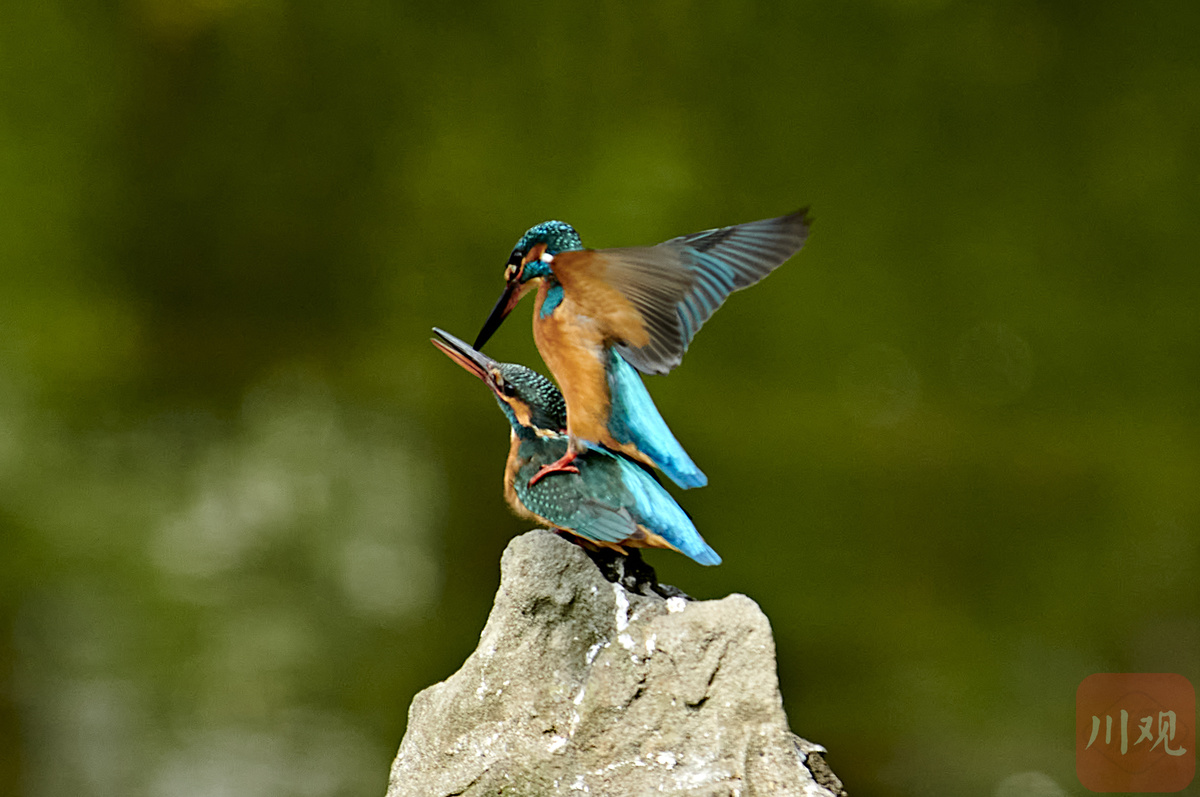 当天,川观拍客在到达文化公园10分钟后,伴随着一阵欢快的鸣叫声,一对翠鸟从远处紧贴水面飞行,停落在池塘中的假山上。从翠鸟现身的那一刻起,池边的嘈杂声戛然而止,取而代之的是相机快门的“咔咔”声。