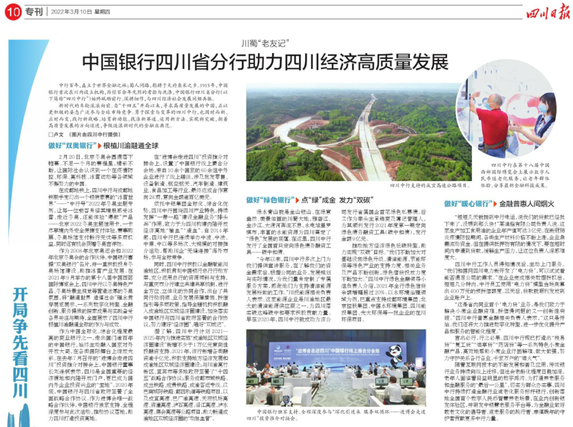 推动地方经济绿色低碳转型,助力实现“双碳”目标。“我们不断加大对基础设施绿色升级、清洁能源、节能环保等绿色产业的支持力度,相关业务及产品不断创新,绿色信贷投放力度不断加大。”四川中行绿色金融领导小组负责人介绍,2021年全行绿色信贷余额增幅超过20%。以水环境治理领域为例,已重点支持成都环境集团、北京控股集团、中国水环境集团、四川能投集团、光大环保等一批企业的在川环保项目。