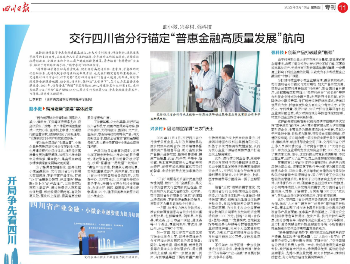 “持续推动普惠金融高质量发展,健全具有高度适应性、竞争力、普惠性的现代金融体系,是时代赋予银行业的使命及责任,也是我们锚定前行的重要航向。”交通银行四川省分行(以下简称“交行四川省分行”)负责人透露,近年来,该行不断延伸金融服务版图,助小微、兴乡村、强科技“三管齐下”,在川大力发展普惠金融业务。2021年,该行普惠“两增”贷款增幅81.28%,增速排名六大行第1位,交行系统第4位;“两增”客户增幅62.27%,排名交行系统第5位,普惠金融服务覆盖率、可得性、满意度不断提升。□李君竹 (图片由交通银行四川省分行提供)