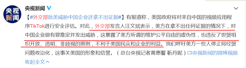 8月3日,外交部回应称:美威胁中国企业还拿不出证据。这不仅暴露了美方所谓的维护公平自由的虚伪性,也违反了世贸组织开放、透明、非歧视的原则。