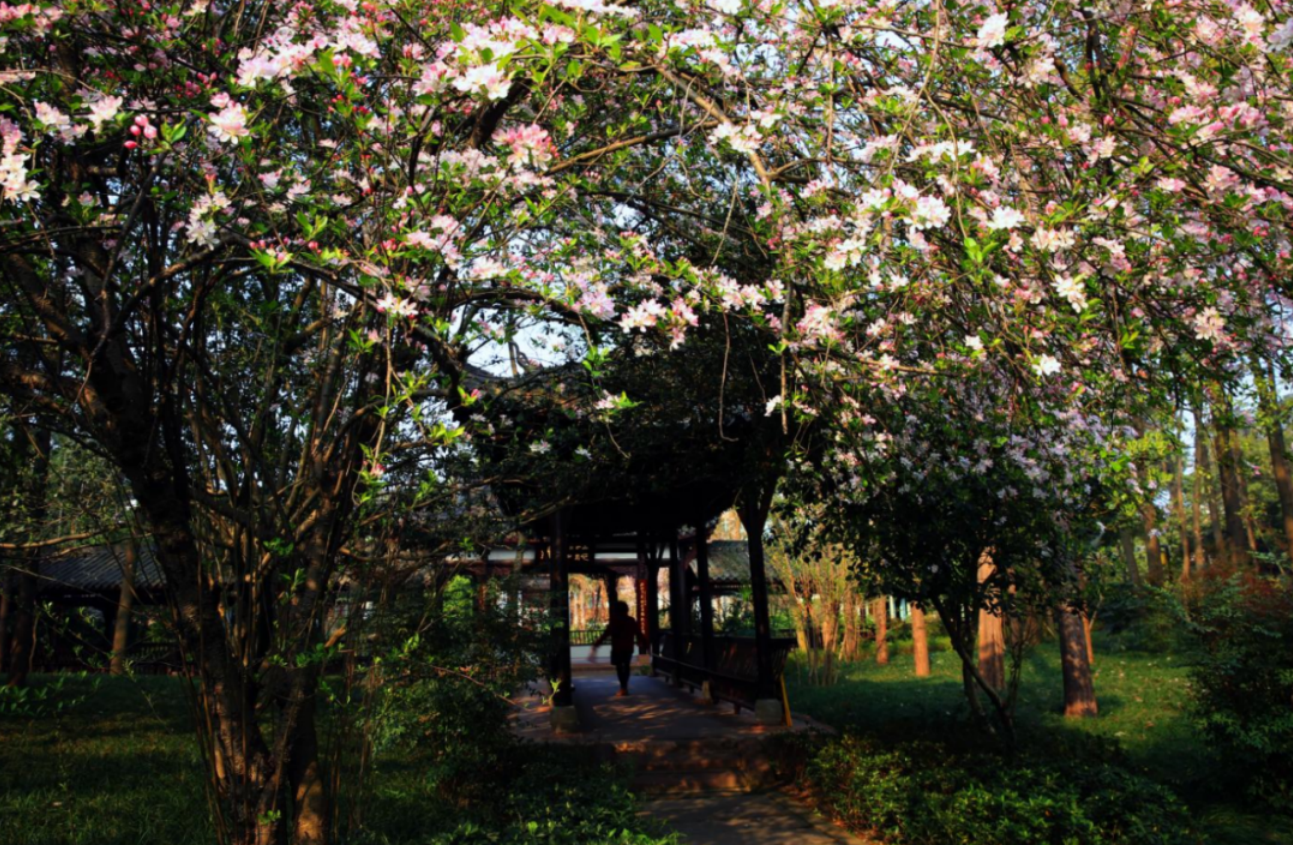“在三苏祠,海棠花的最佳观赏处有两处,一处是西部园林区的海棠林,一处是消寒馆。据记载,消寒馆是三苏祠里最早栽植海棠的地方。该馆坐西向东,前为堂后为院,回廊相连、曲水相拥、古木相抱。内有两个庭院,其中一个庭院孤植了一株海棠,今已高出院墙,亭亭若盖。2013年雅安‘4·20’震后大修时,我们围绕这株海棠,树下垒台,四周建池,缀汀步,铺卵石,种水草,养游鱼。”三苏祠博物馆馆长陈仲文介绍。