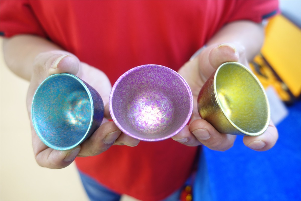 单就钛健康生活馆来说,展出的产品非常丰富,共有餐具、茶具、饰品、眼镜、体育用具等2000多种钛系列产品。其中,在不同光线下呈现不同色彩的钛板画,自带“美颜”功能的彩色钛茶杯,格外引人注目。“这些色彩是天然的,不会掉色生锈。“攀枝花市钛产业双创服务中心负责人赵正林说,制作过程中,在不同的温度下,施加不同的电流,钛金属就会呈现出不同颜色。