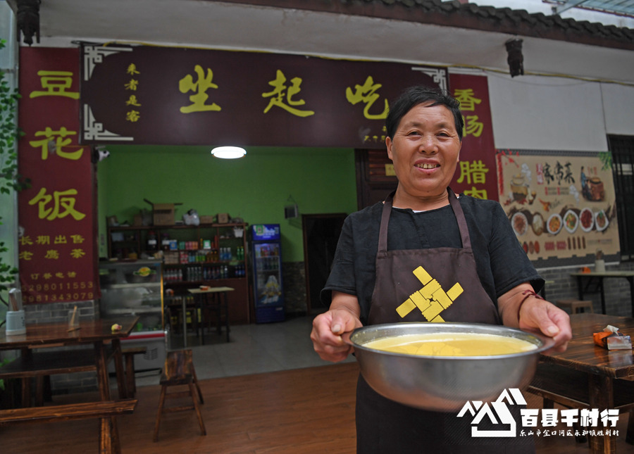 63岁的胜利村村民周明素手捧亲手磨制的豆花站在自己的农家乐前留影。