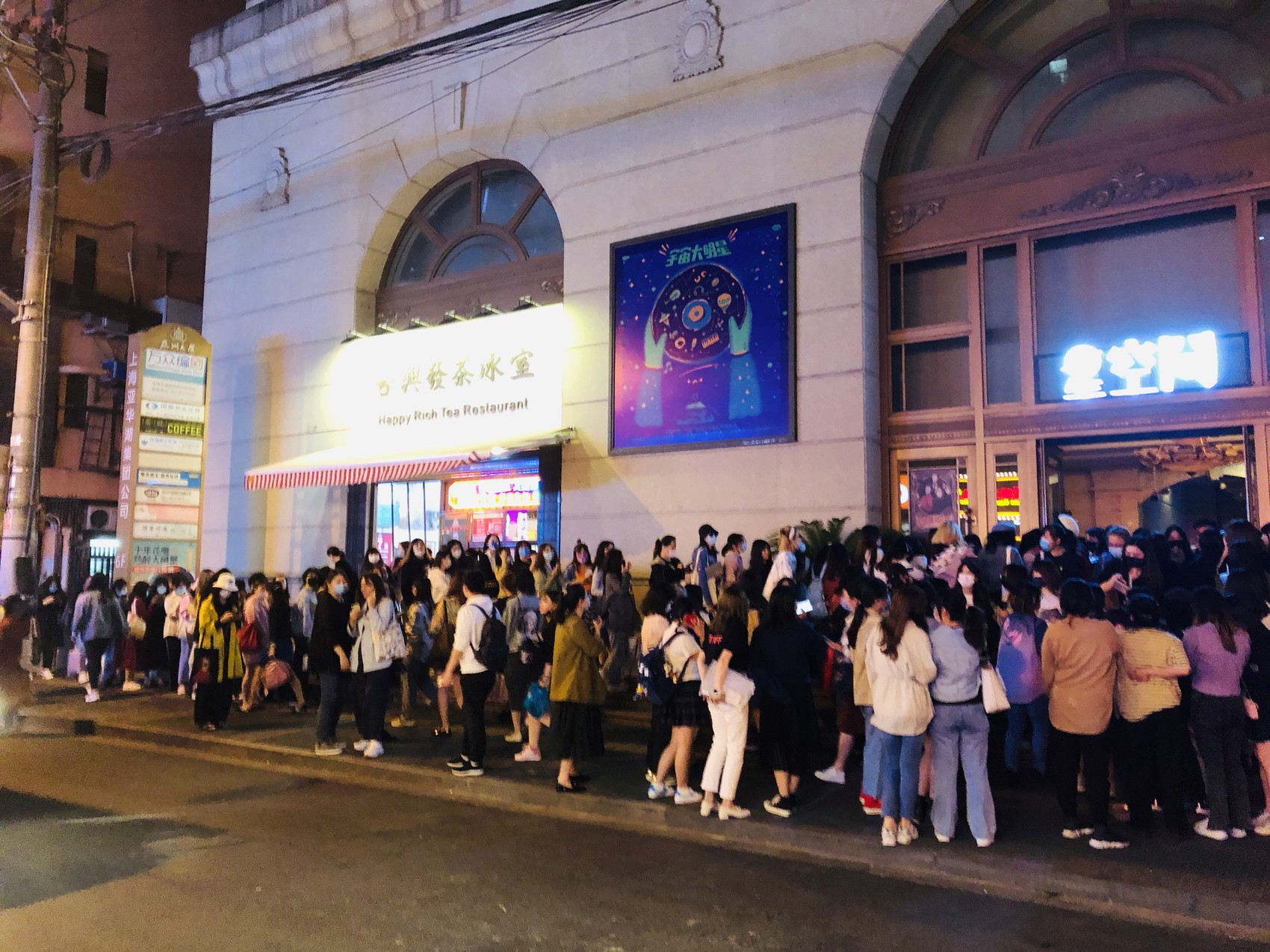 排队进场看剧的观众在上海亚洲大厦门前排起了回旋的长队