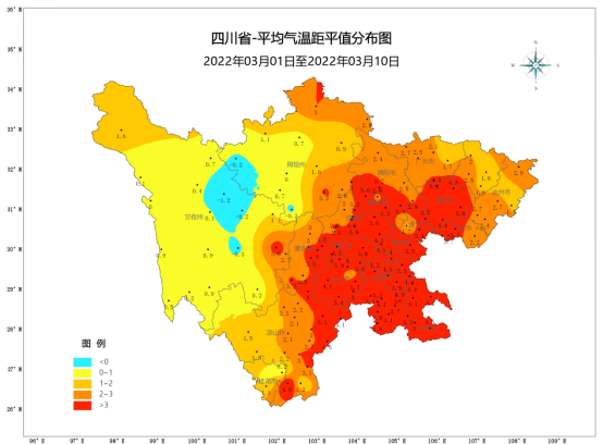 据四川省气候中心监测,3月上旬,全省平均气温12.8℃,与历史同期相比偏高2.8℃,排历史同期第4高位。其中,四川盆地中部、西南部和南部平均气温偏高3-4℃;温江站平均气温偏高3.3℃。