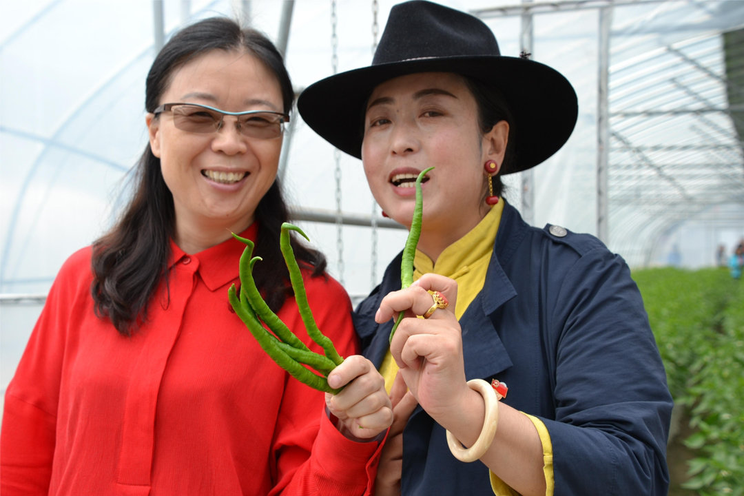 兰天雪(左)与呷巴乡藏族党委书记扎珠分享援建农业项目丰收的喜悦