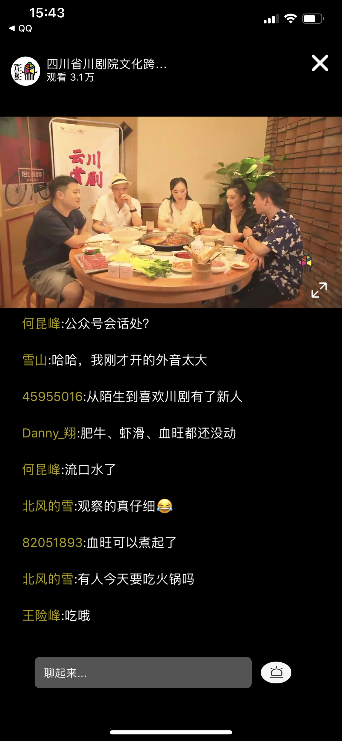 此次直播活动邀请了四川省川剧院培养的第一代川剧科班演员钱兆鸿老师,如今活跃在川剧舞台上的四川省川剧院一级演员张燕,90后川剧新生代演员万多、朱婷婷,青年川剧爱好者陈思蒙五人,围坐一炉吃着老火锅,推介火锅美食、摆川剧龙门阵。直播现场五位分别以不同的视角出发,畅聊四川省川剧院建院60年中,他们乘风破浪一路走来,见证剧院从建立走向辉煌的历程。在谈笑风生、麻辣鲜香中,感受川剧的昨天、今天和明天,来一场川味十足的云赏川剧。