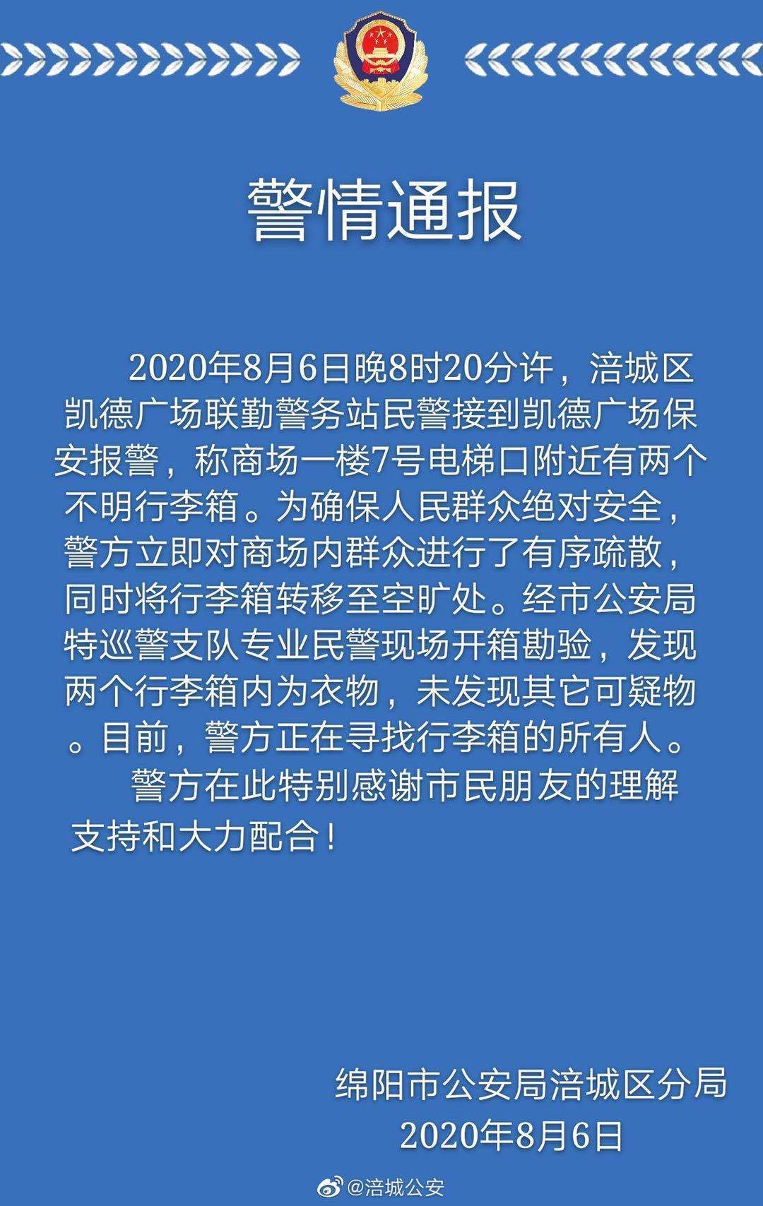 22时许,绵阳公安局涪城分局发布警情通报,当晚8时20分许,涪城区凯德广场联勤警务站民警接到凯德广场保安报警,称商场一楼7号电梯口附近有两个不明行李箱。