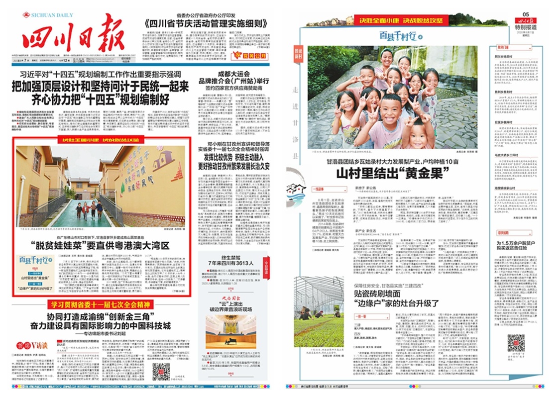 一版正中的大幅照片,是甘洛县蓼坪乡清水村的孩子们,手牵手从新居旁路过。五版特别报道版上最显眼的照片,也是摄影记者记录的孩子们的笑脸。