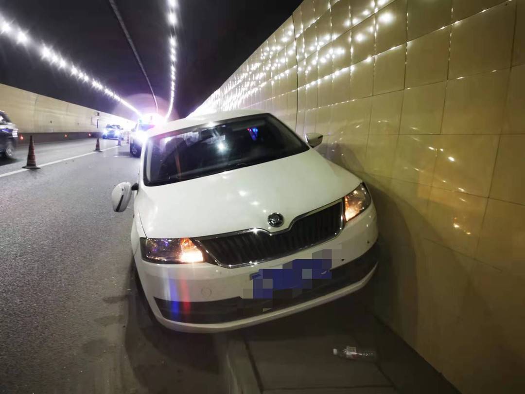 据高速公路公安局三分局十四大队民警介绍,接到报警后,他们迅速赶往事故现场。一辆白色小型轿车调转车头停靠在靠近超车道隧道壁上,后面慢车道是一辆半挂型货车,小轿车左边车侧尾部有明显的撞击痕迹。幸运的是没有人员受伤。
