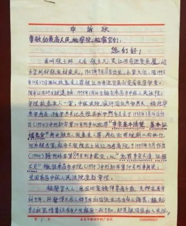 在狱中,张玉环一直没有放弃申诉。不会写字,就找人替自己写申诉状,再照着抄一遍。