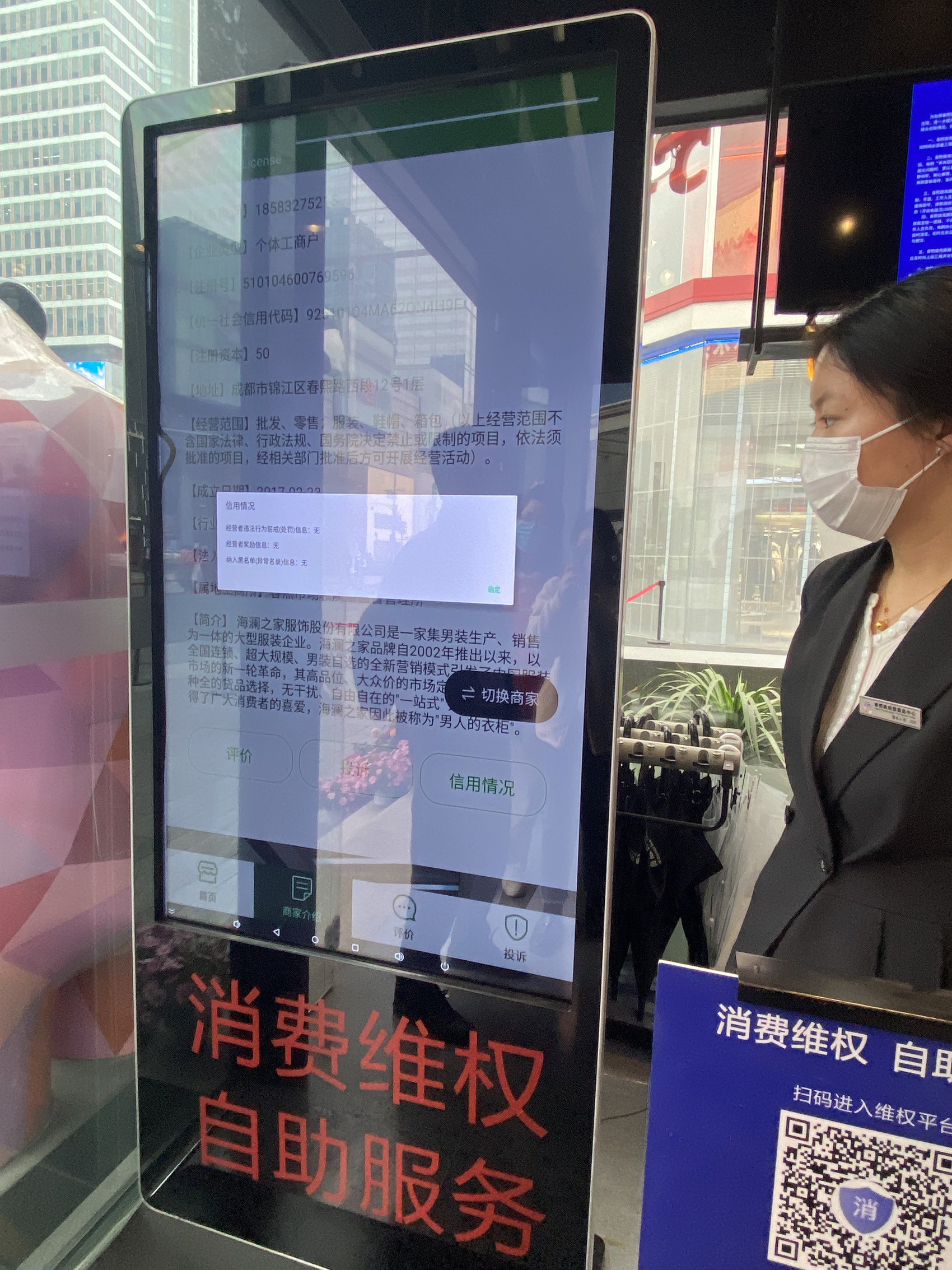 在春熙路商圈的服务中心内,有一台“成都消费市场智能服务平台”终端机,展示着春熙路商圈内400余户商家的信息,供消费者现场进行查询、投诉、建议、评价等。与此同时,消费者也可扫描各商家店内张贴的投诉专用二维码,第一时间将投诉、建议等内容上传至成都消费市场智能服务平台。