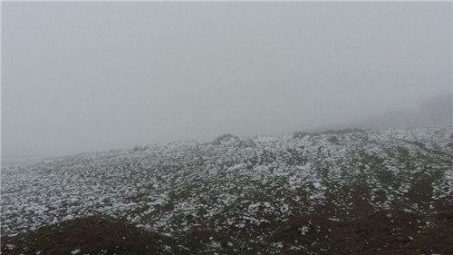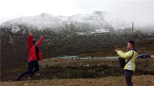 6月15日,四川日报记者途径阿坝藏族羌族自治州松潘县境内看到,海拔4000多米连绵起伏的山脉披上银装,放眼望去成遍地雪山,吸引不少游客前来游玩避暑。