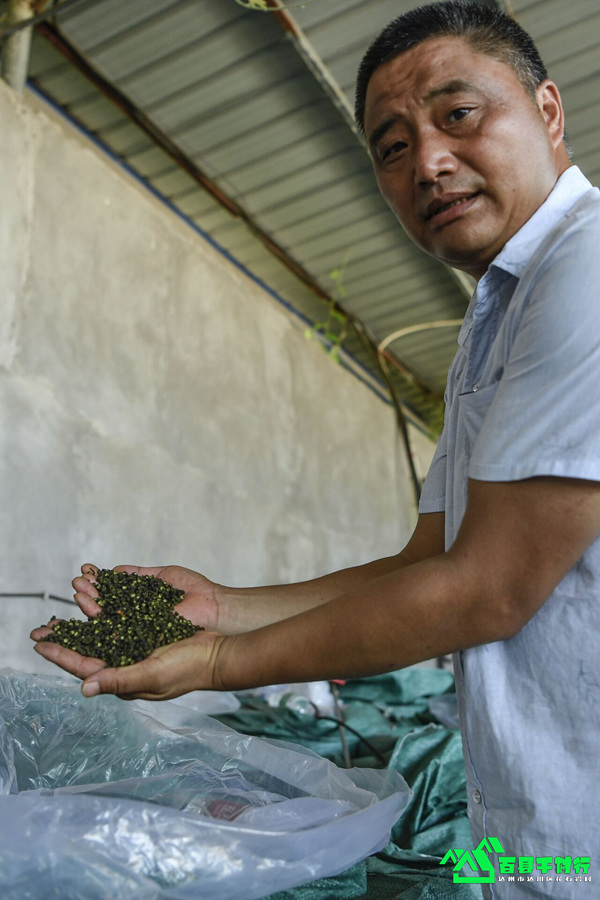 达州市达川区花石岩村村民展示新收获的青花椒。