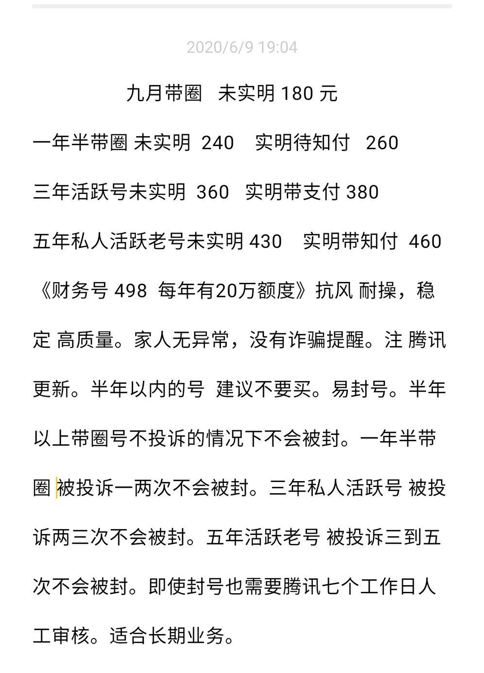 记者注意到,在该客服发来的价目表下方也给出了各类提示,上面标注:三年私人活跃号,被投诉两三次不会被封,五年活跃老号,被投诉三到五次不会被封。即使封号也需要腾讯七个工作日人工审核,适合长期业务。