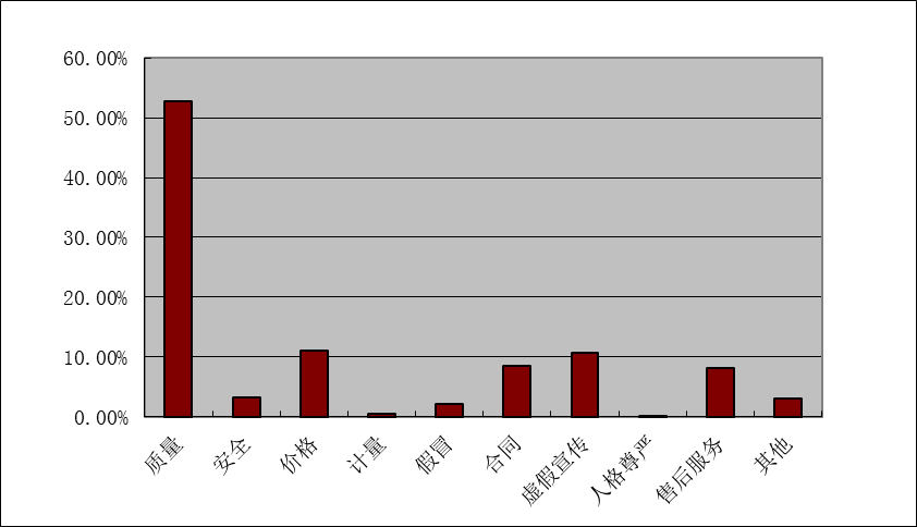 川观新闻记者梳理发现,投诉问题按性质分,质量问题占52.7%,居投诉榜首。其次是价格问题占11.03%,虚假宣传问题占10.76%,合同问题占8.45%,售后服务问题占8.07%,安全问题占3.17%,假冒问题占2.13%,计量问题占0.59%,人格尊严问题占0.06%,其他问题占3.03%。