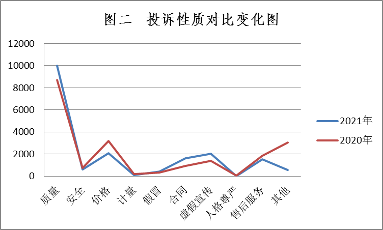 与2020年相比,涉及安全、价格、计量、人格尊严、售后服务等的投诉比重有所下降,涉及质量、假冒、合同、虚假宣传的投诉比重则有所上升。