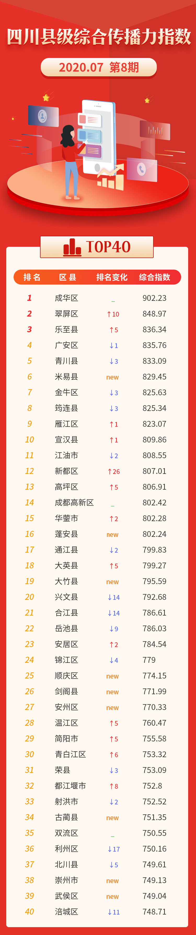 本期指数前40名中,相较于6月,新入围县(市、区)9个(占比22.5%),攀枝花米易县在7月新入围即到第6名。从统计结果看,成华区蝉联第一,其次是宜宾市翠屏区、资阳市乐至县、广安市广安区、广元市青川县位列前五。成都市新都区上升幅度最大,宜宾市翠屏区进步显著。