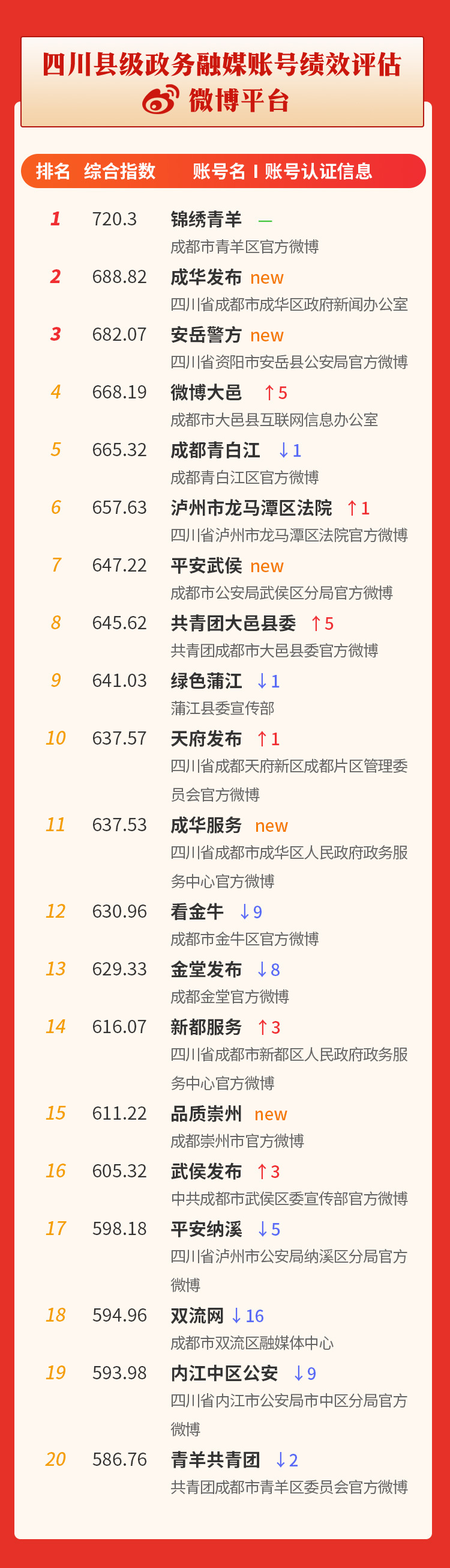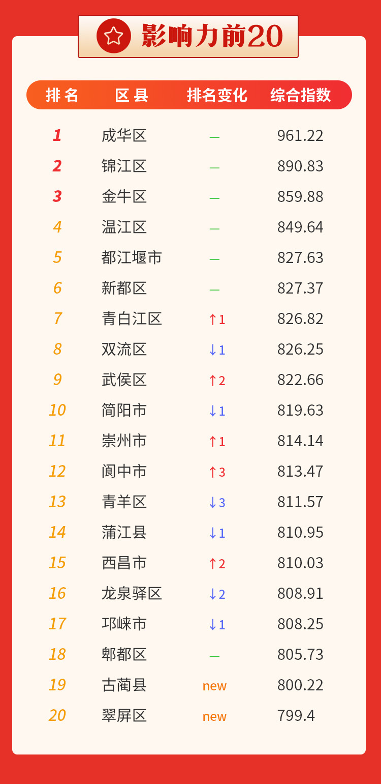 从影响力前20名统计结果看,排名变动较小,前六名均与上月一致。成都市成华区蝉联第一,南充市阆中市上升幅度最大,泸州市古蔺县、宜宾市翠屏区是新入围县(市、区)。