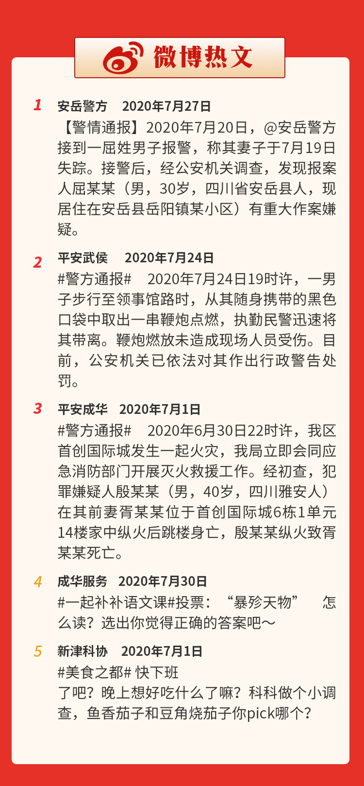 社会事件关注度高,公安微博的警情通报响应快、影响广。7月,四川有几起社会事件引发关注,当地公安的政务微博警情通报微博发布及时,充分发挥了良好的舆论引导作用,如“安岳警方”微博发布的“男子杀妻报失踪案”通报、“平安武侯”微博发布的“男子在成都领事馆路放鞭炮”通报、“平安成华”微博发布的“男子家中纵火后跳楼”通报、“郫县公安”微博发布的“母亲虐打儿子”通报,较快地回应了公众关切,做到了及时传递信息、避免舆情发酵,单条微博的传播数据均过万。
