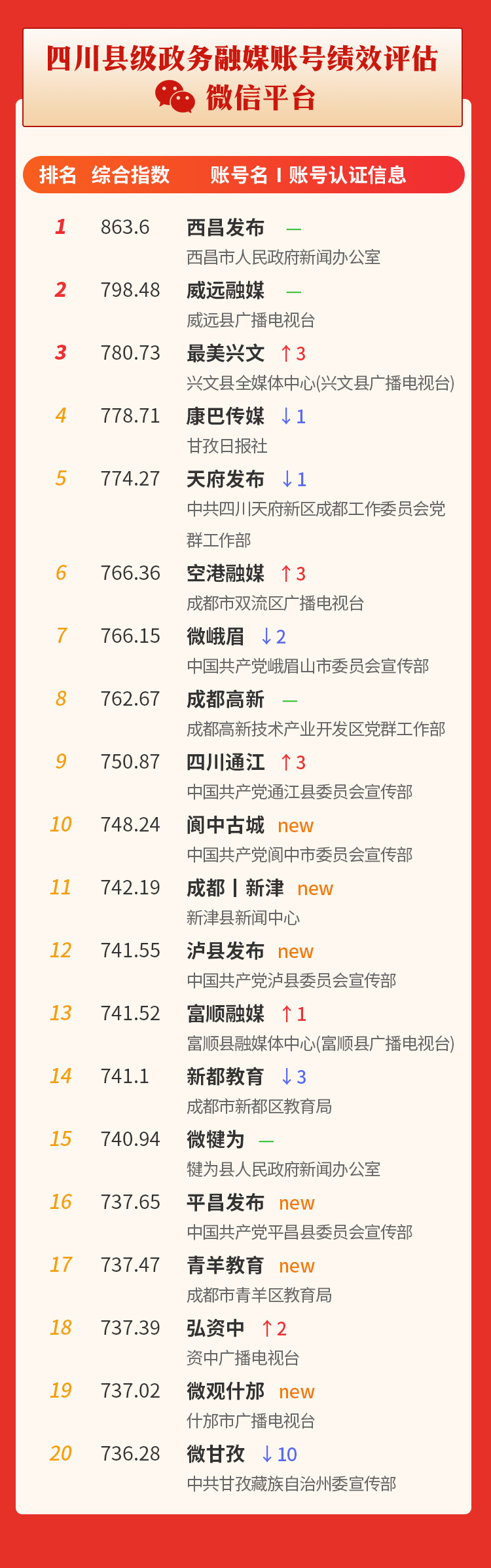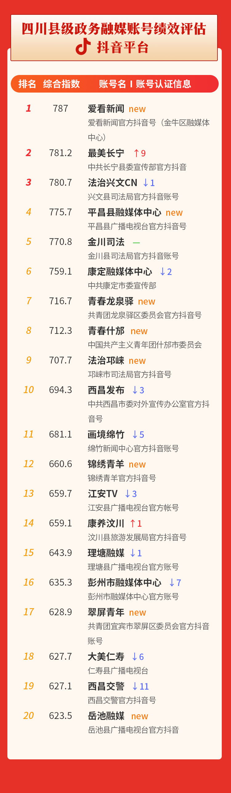 为具体观测四川各县级政务号、媒体号的发展情况,把握各县级官方账号在地方宣传、社会治理等方面的传播力、影响力,从5月起,我们特别新增指数项目——“四川县级政务融媒账号绩效评估”。