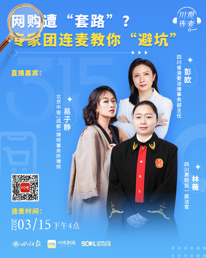3月15日,川观新闻记者结合当日实施的《最高人民法院关于审理网络消费纠纷案件适用法律若干问题的规定(一)》和典型案例,邀请了四川高院民一庭法官林薇、四川省消委法律事务部主任彭欧,以及四川日报律师帮帮团成员北京中银(成都)律师事务所律师易子静,与记者和热心网友进行连麦直播。在连麦的1个半小时里,直播间观看人数到达19.5万,赢得了网友的好评。